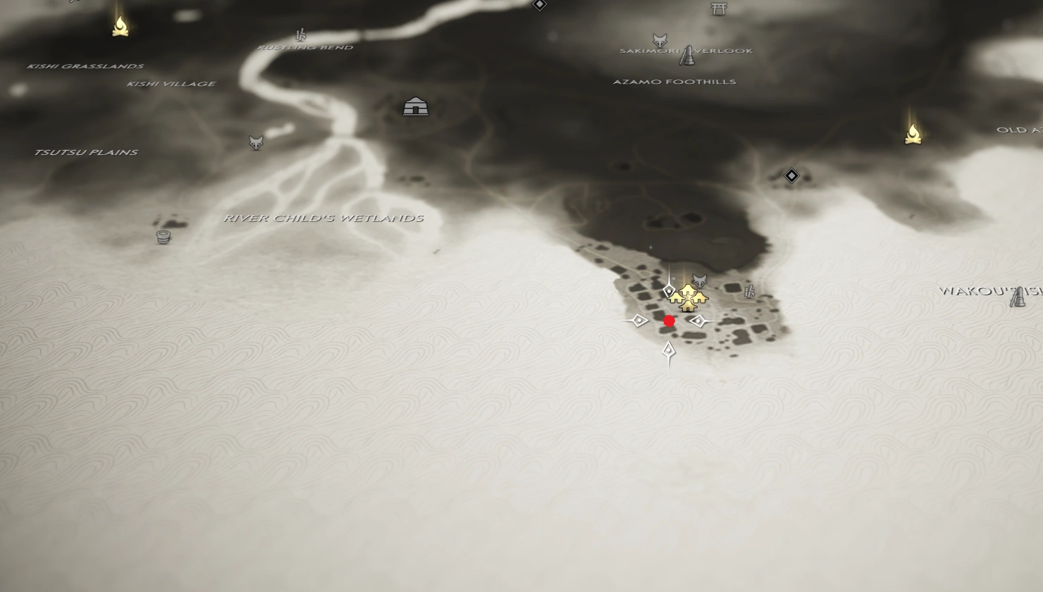 After liberating Azamo Bay, Jin Sakai encounters a citizen, Hyoe, that brings Jin his shop to discuss his neighbor, Haruo's clandestine activities at night. Hyoe followed his neighbor to a cemetery and witnessed a meeting with bandits. Jin goes out to the cemetery to investigate and notices a recent fire, some bloody bandages and a half-eaten meal. Jin goes outside, hides in the pampas grass and waits for the neighbor to return.