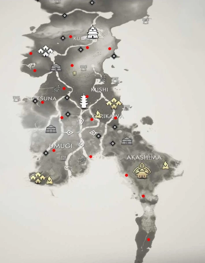 There are 49 Inari Shrines on Tsushima: 22 in Izuhara, 17 in Toyotama, and 10 in Kamiagata. Below are the locations of the Fox Dens that lead to the shrines.