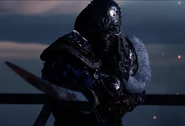 As the duel went on, Khunbish repeatedly chatisied Jin for not accepting the Eagle's gift, to which an annoyed Jin eventually retorted that Khunbish was wasting "the air we breathe". Despite frequently switching weapons (Flaming sword and shield, dual-wielding sabers, halberd) and stances to confuse his foe, the Mongol Commander was defeated by Jin. Outmatched by the Samurai, Khunbish opted to cut his losses and run, leading Jin to label him a coward before chasing after him.