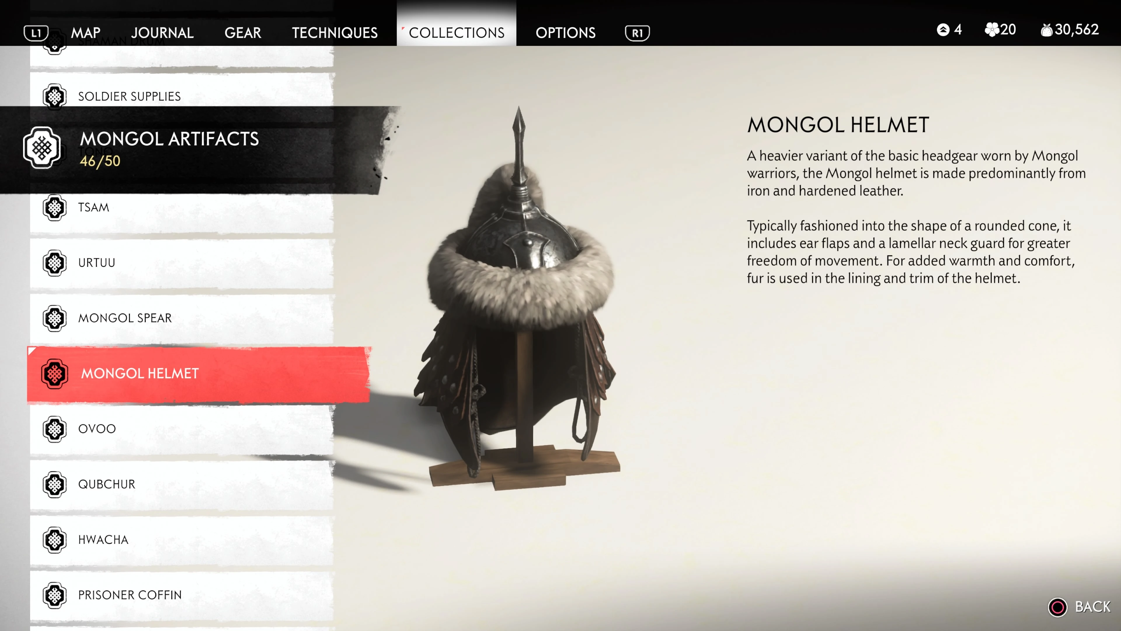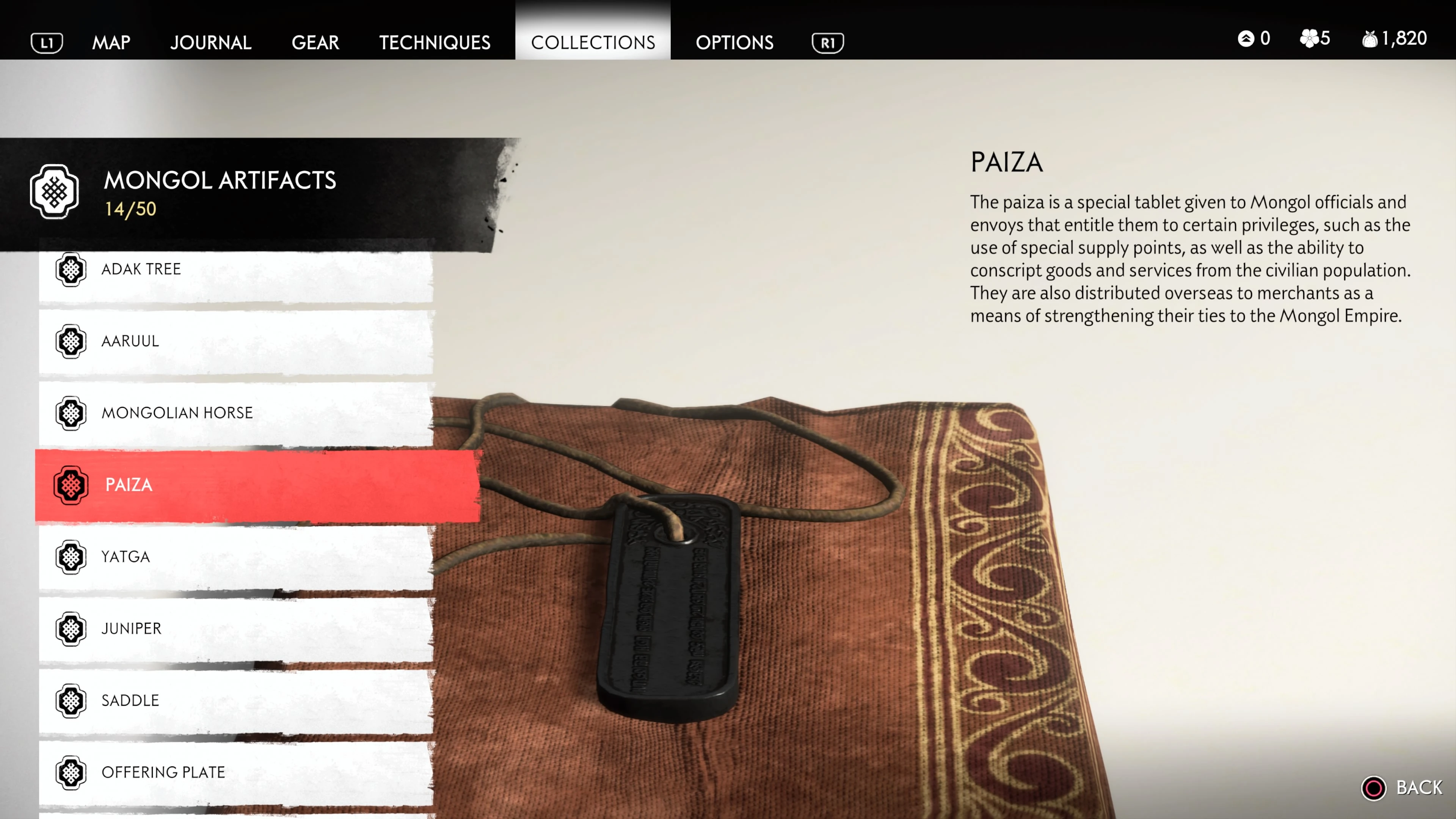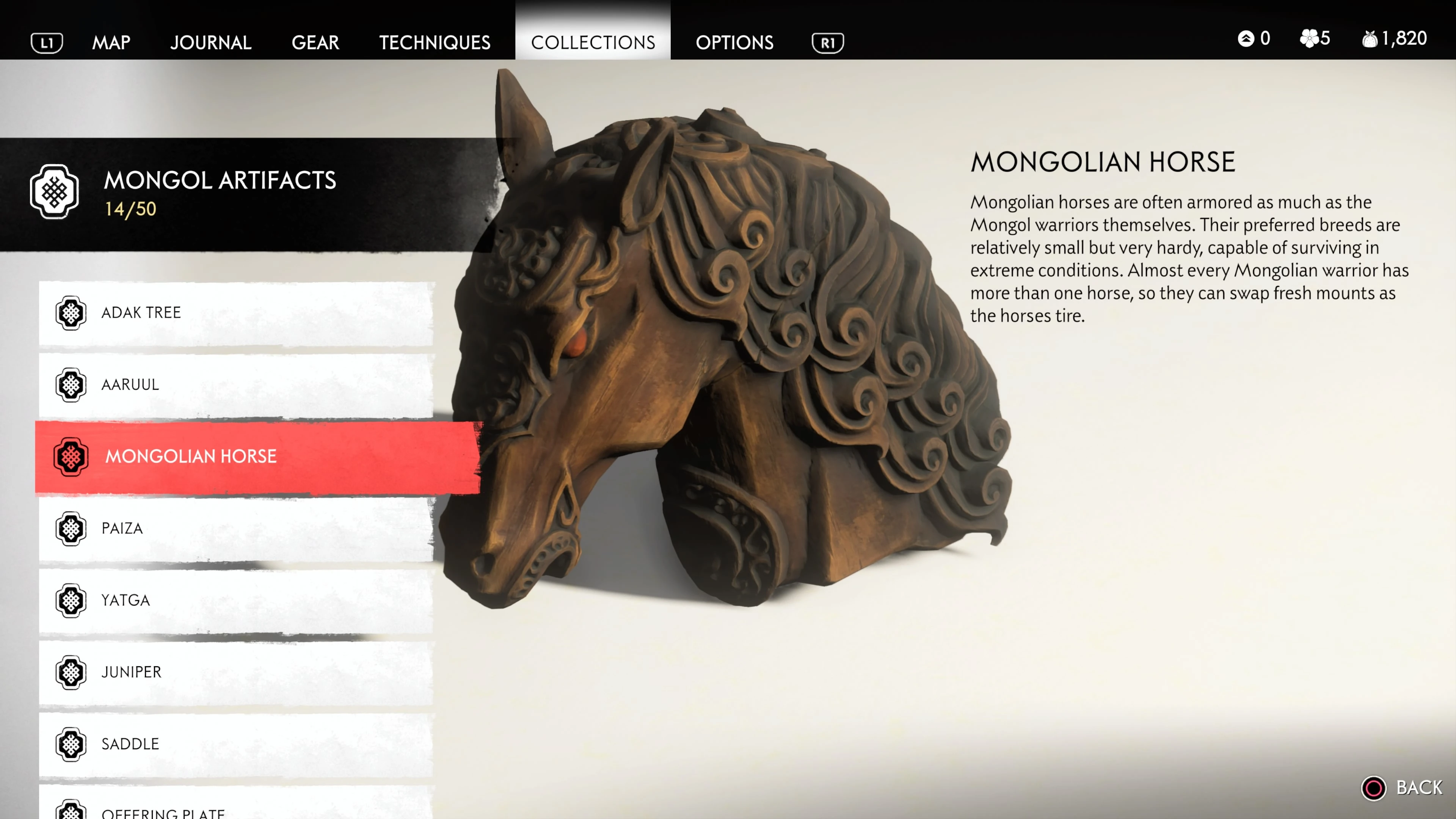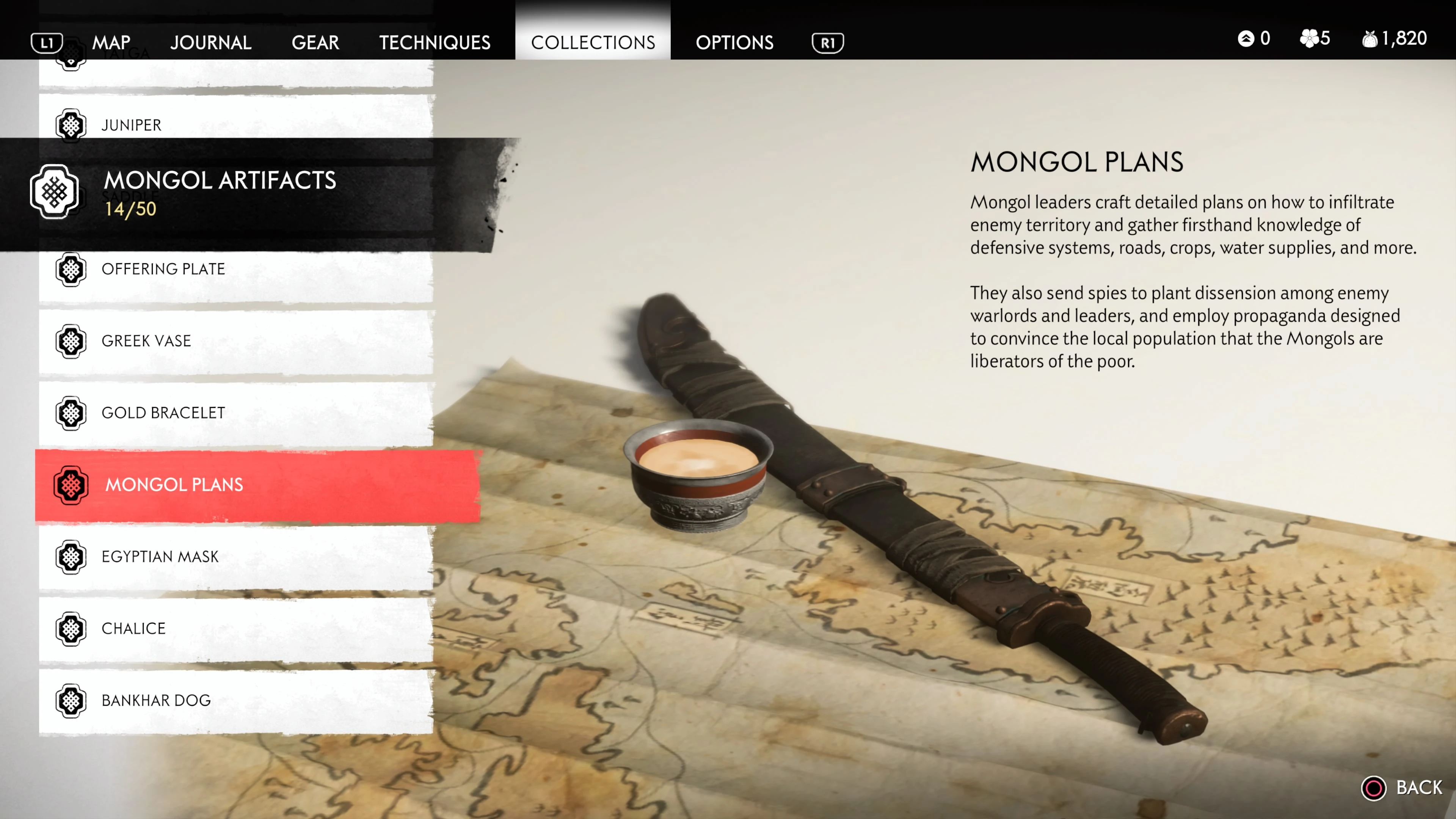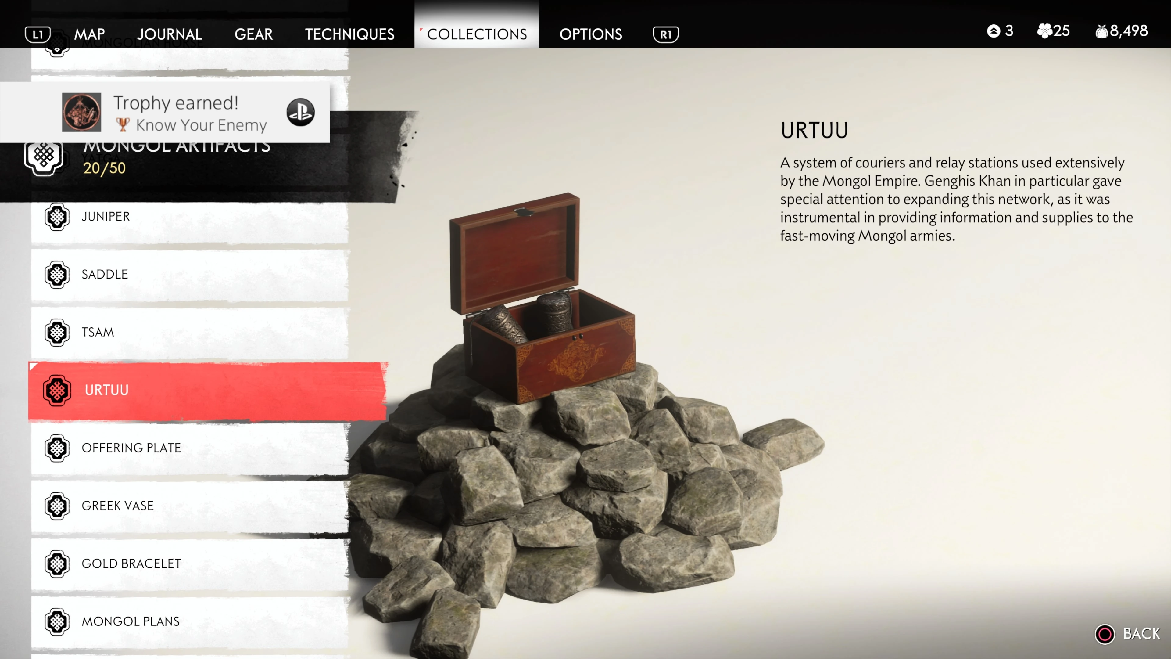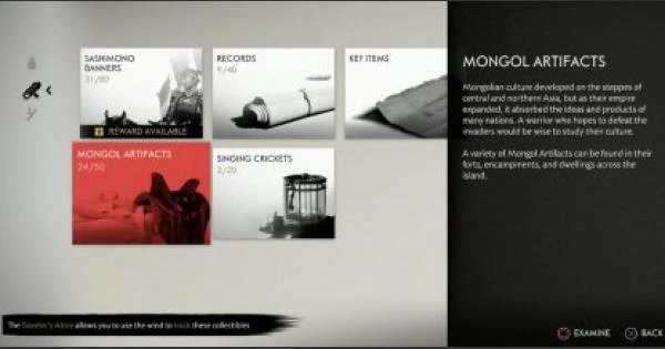 Mongol Artifacts are collectible items that are found throughout the island of Tsushima. They provide useful information on the Mongol Empire, including their way of life and approach to war. There are fifty (50) Mongol Artifacts in the game and collecting twenty (20) of them counts towards the "Know Your Enemy” trophy.