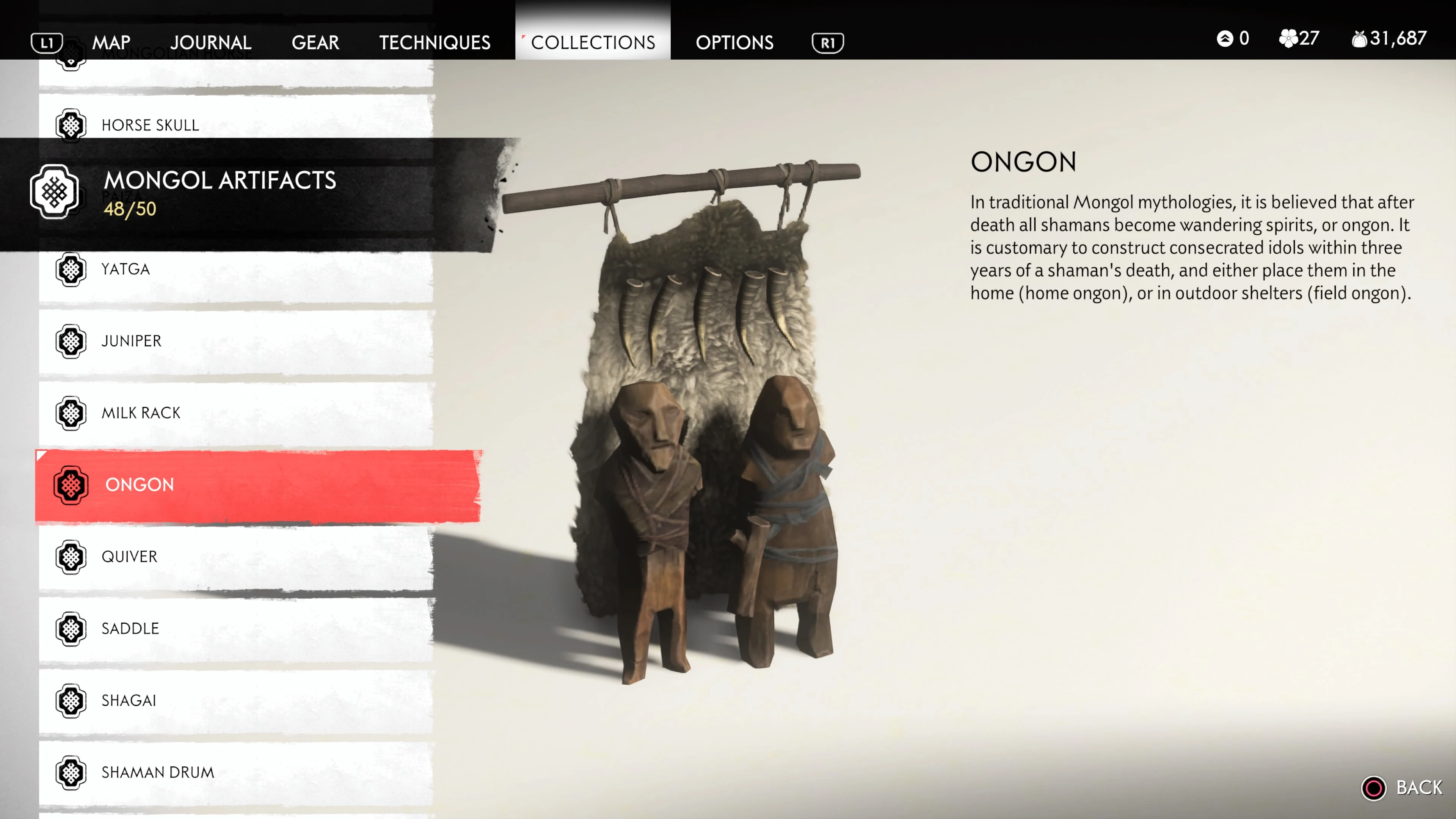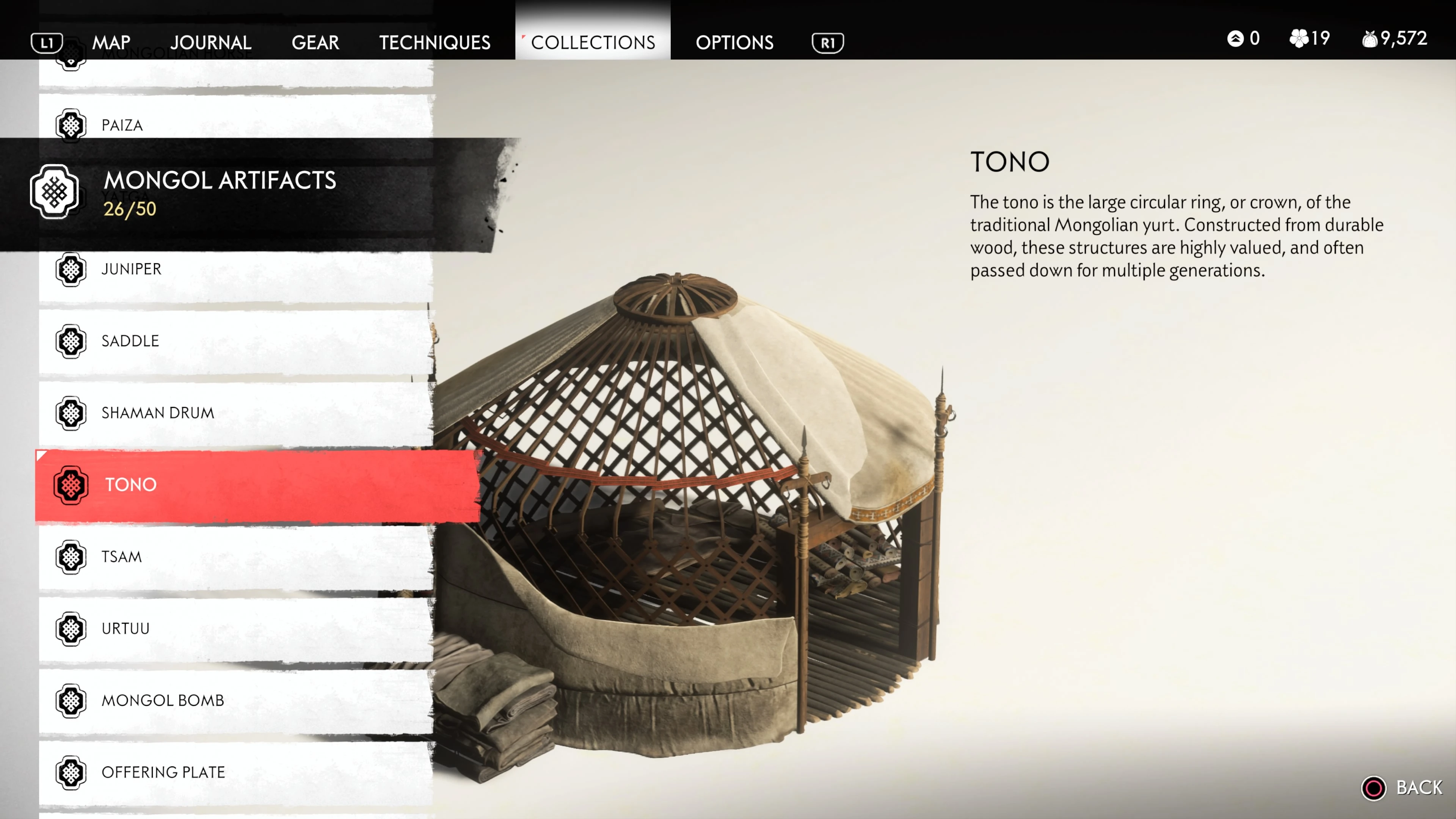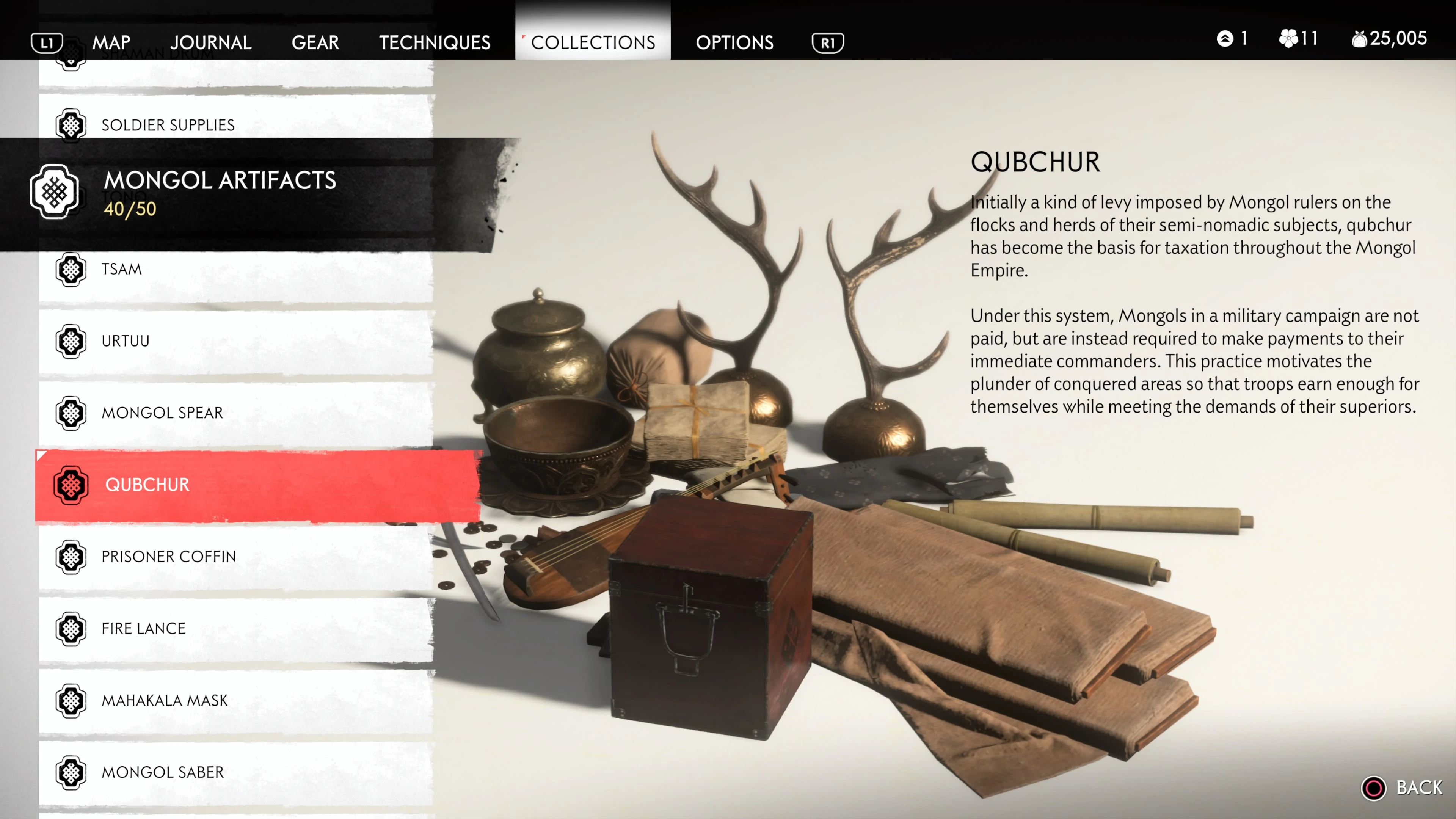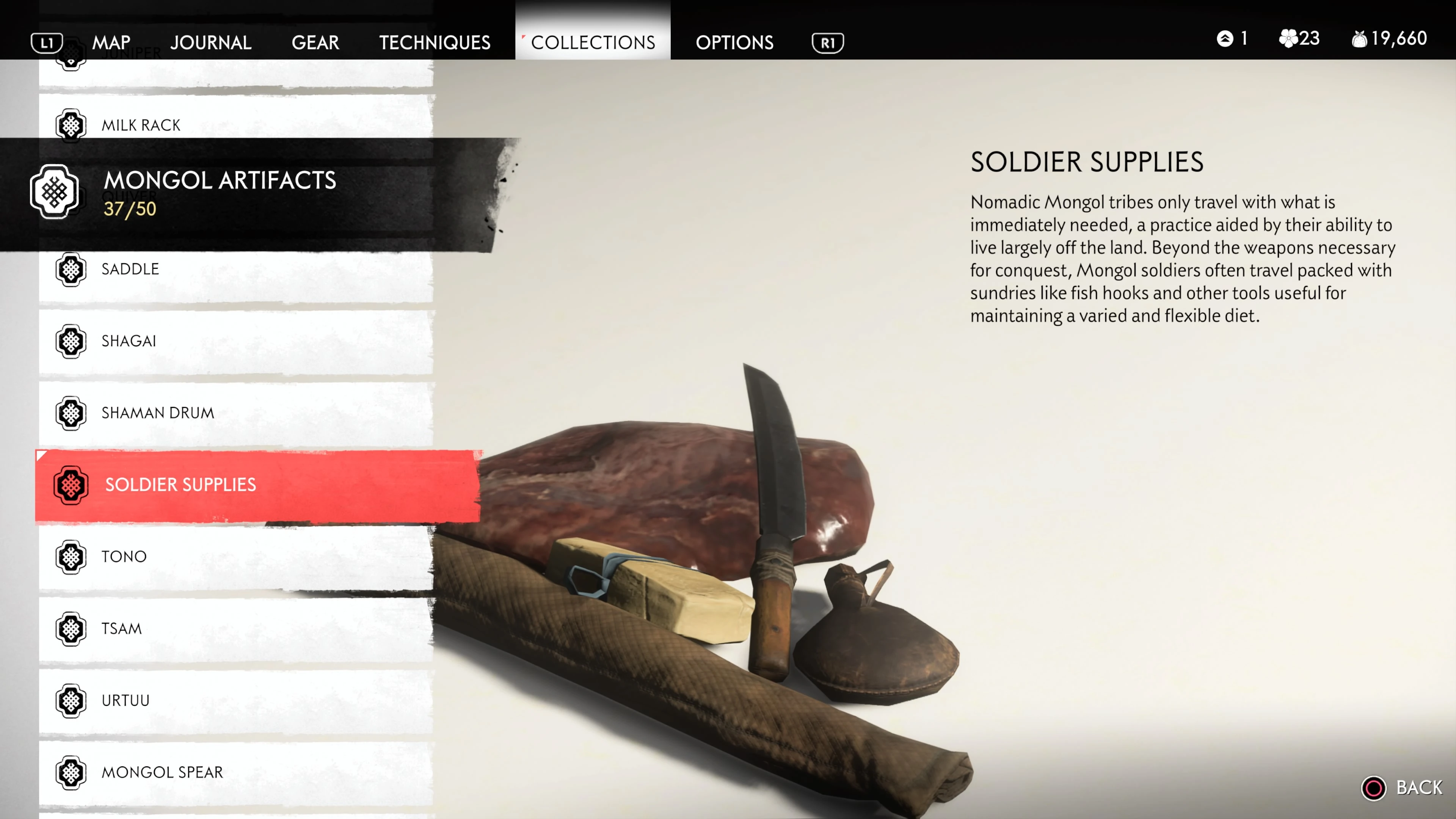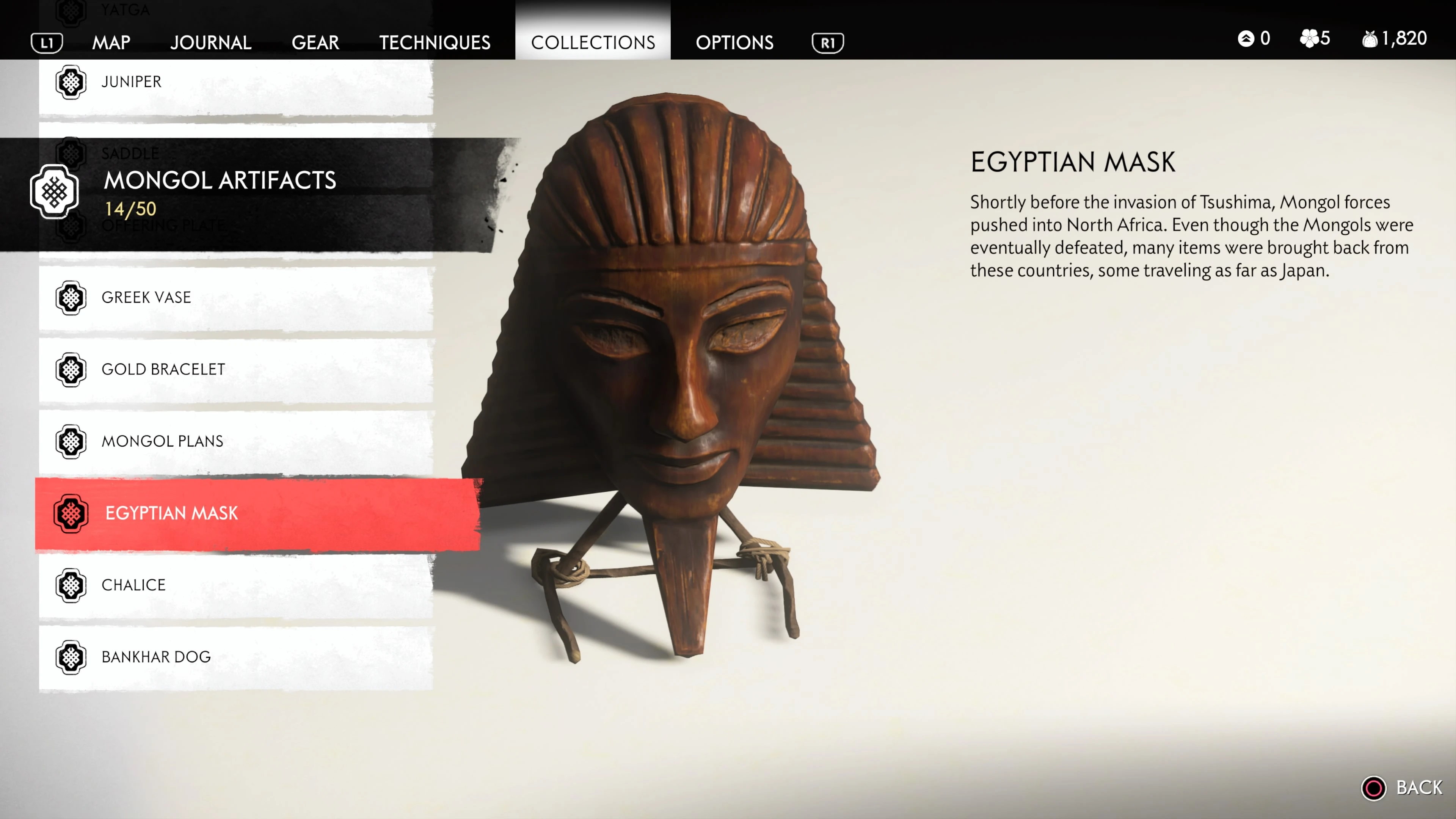 Mongol Artifacts are collectible items that are found throughout the island of Tsushima. They provide useful information on the Mongol Empire, including their way of life and approach to war. There are fifty (50) Mongol Artifacts in the game and collecting twenty (20) of them counts towards the "Know Your Enemy” trophy.