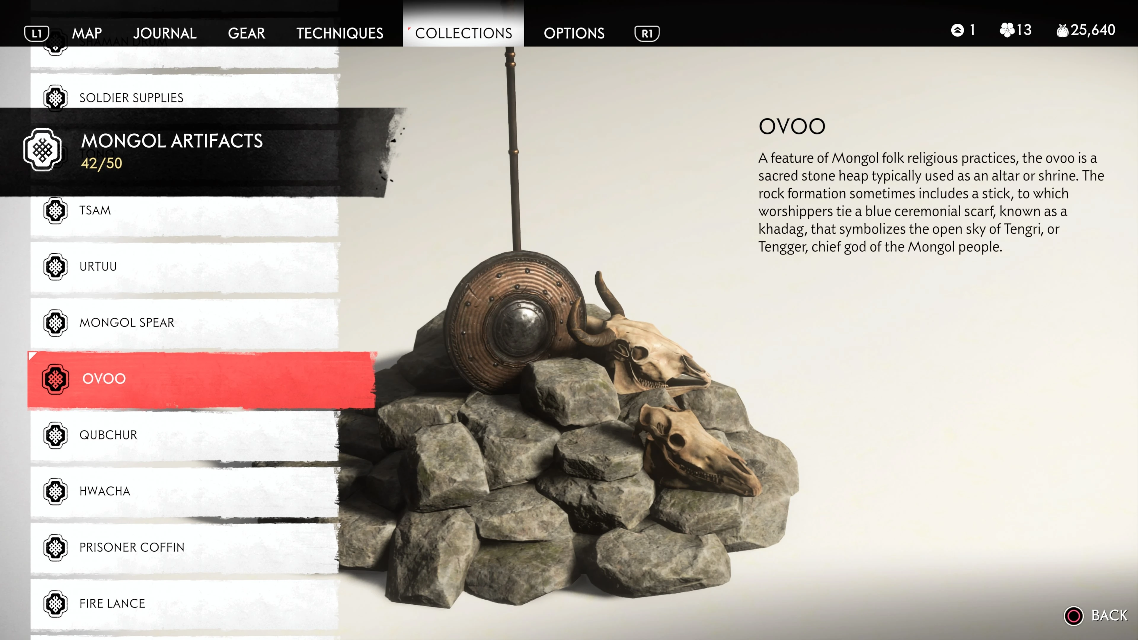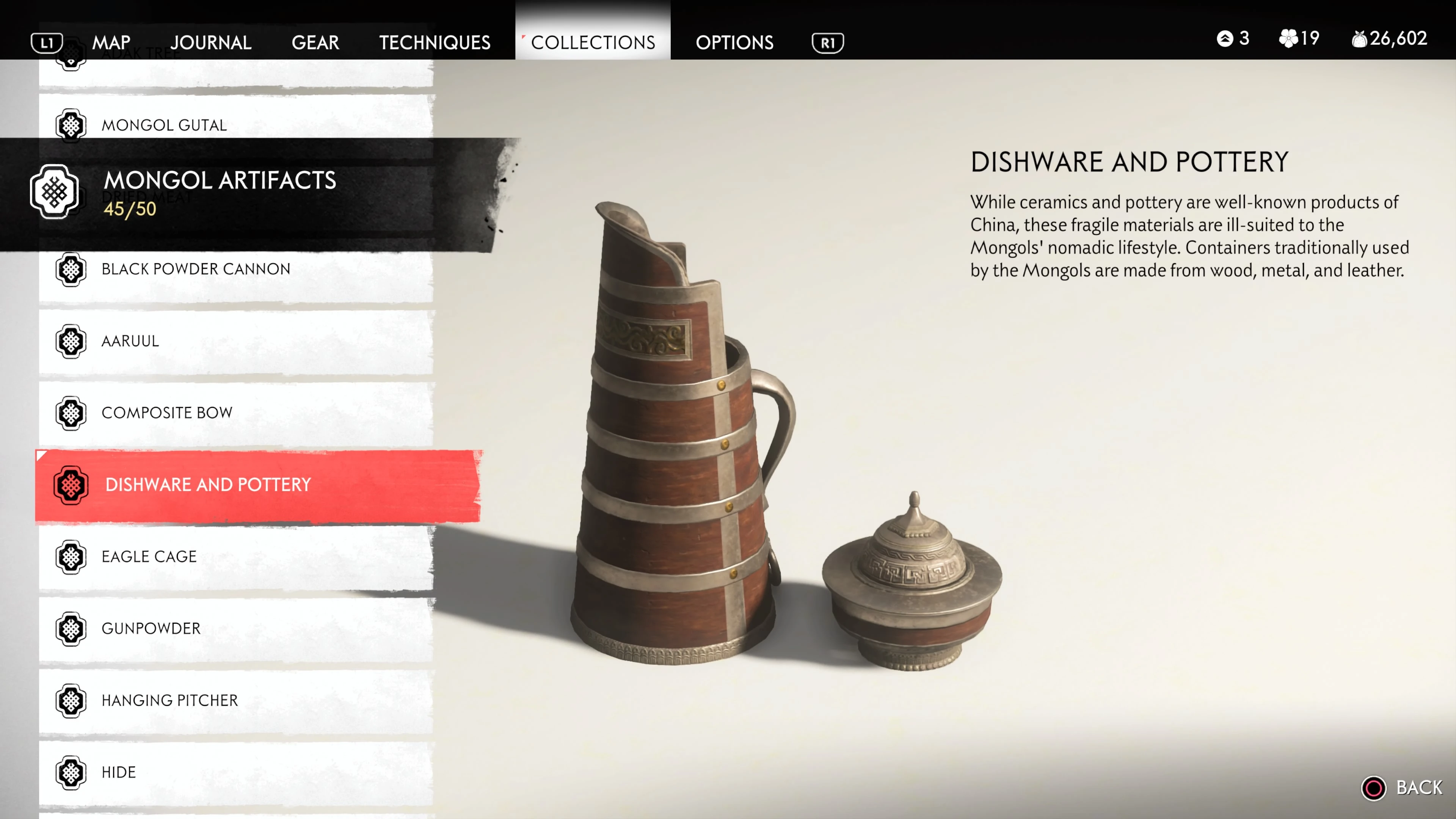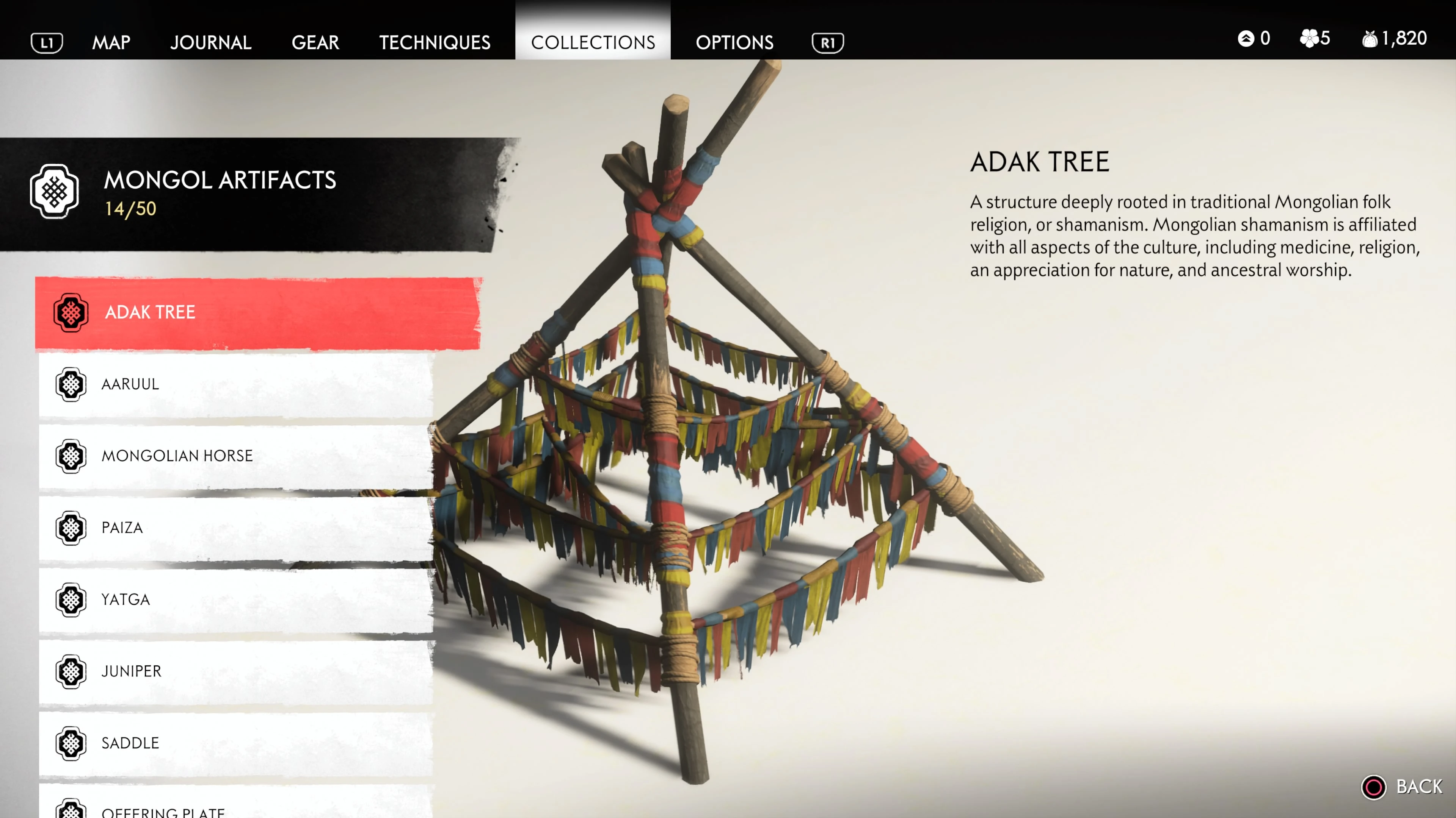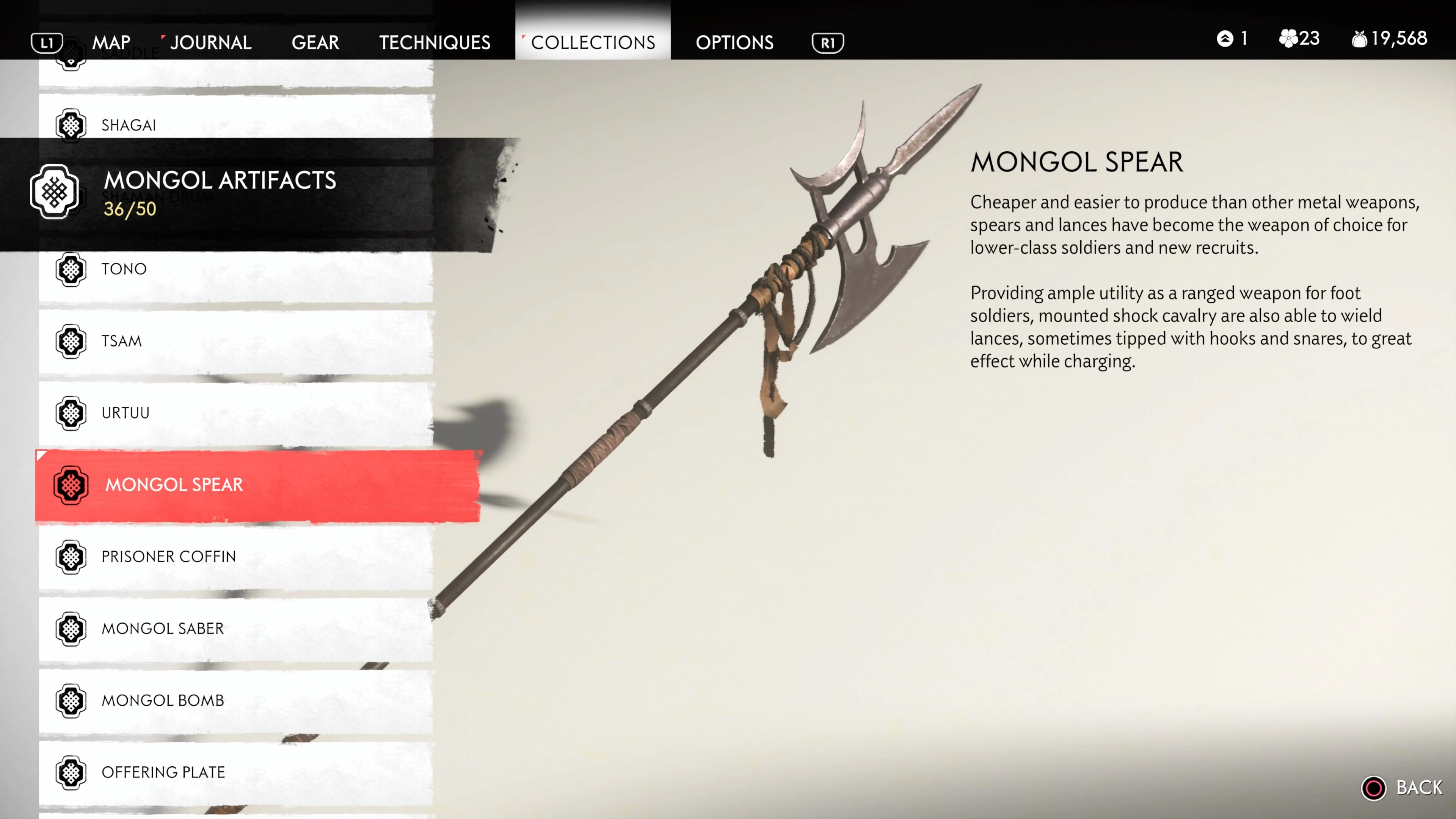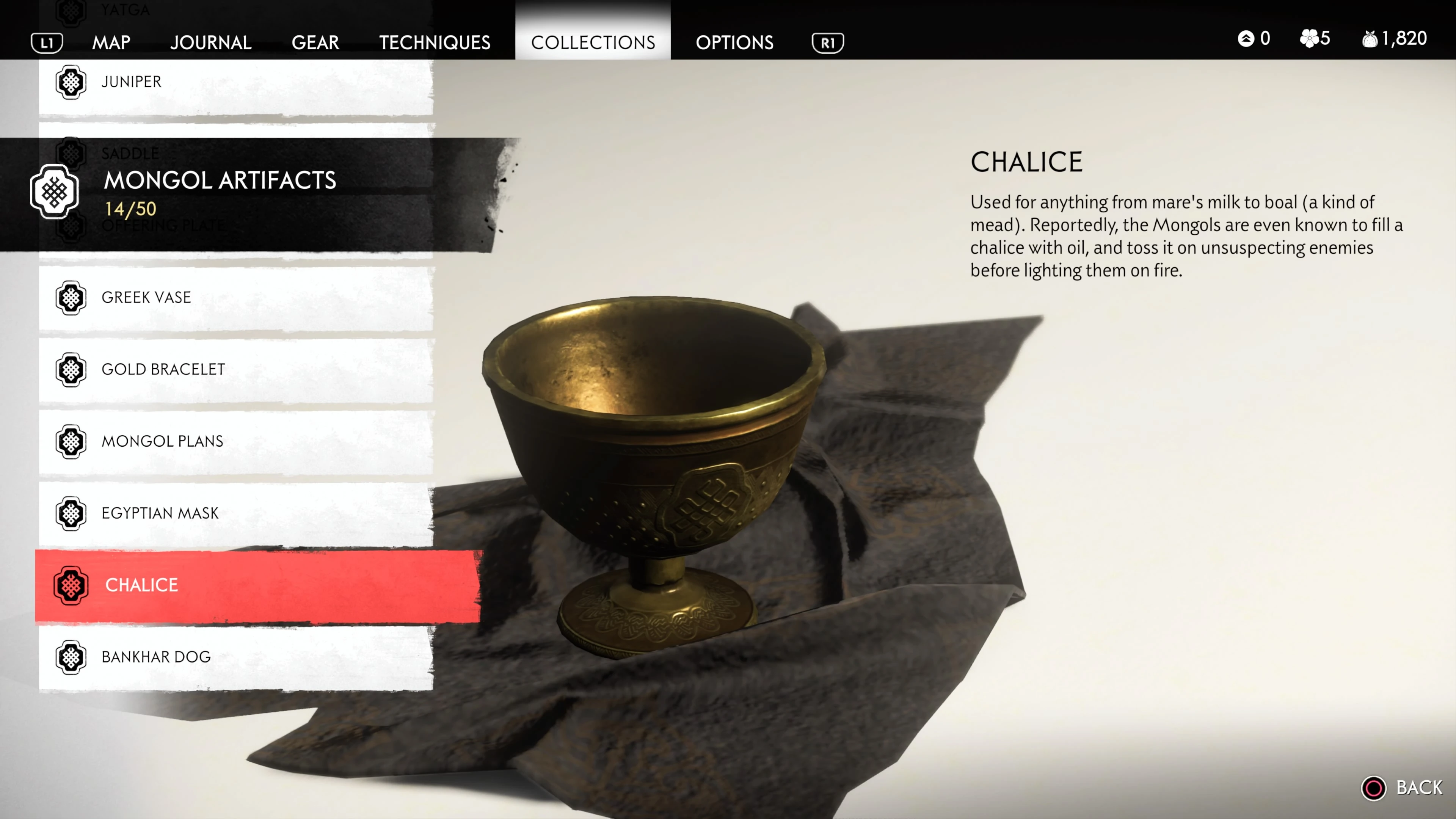 Mongol Artifacts are collectible items that are found throughout the island of Tsushima. They provide useful information on the Mongol Empire, including their way of life and approach to war. There are fifty (50) Mongol Artifacts in the game and collecting twenty (20) of them counts towards the "Know Your Enemy” trophy.