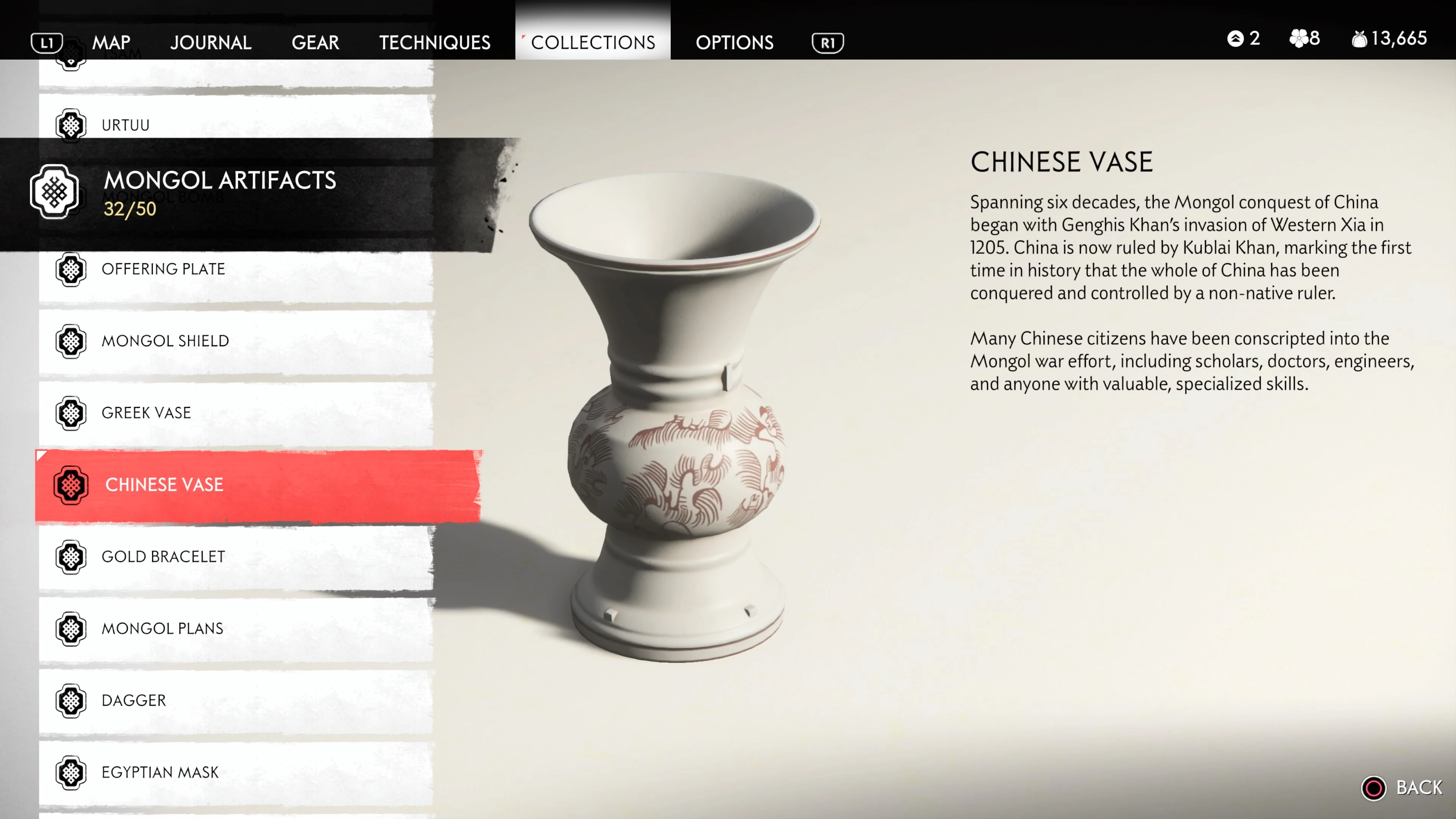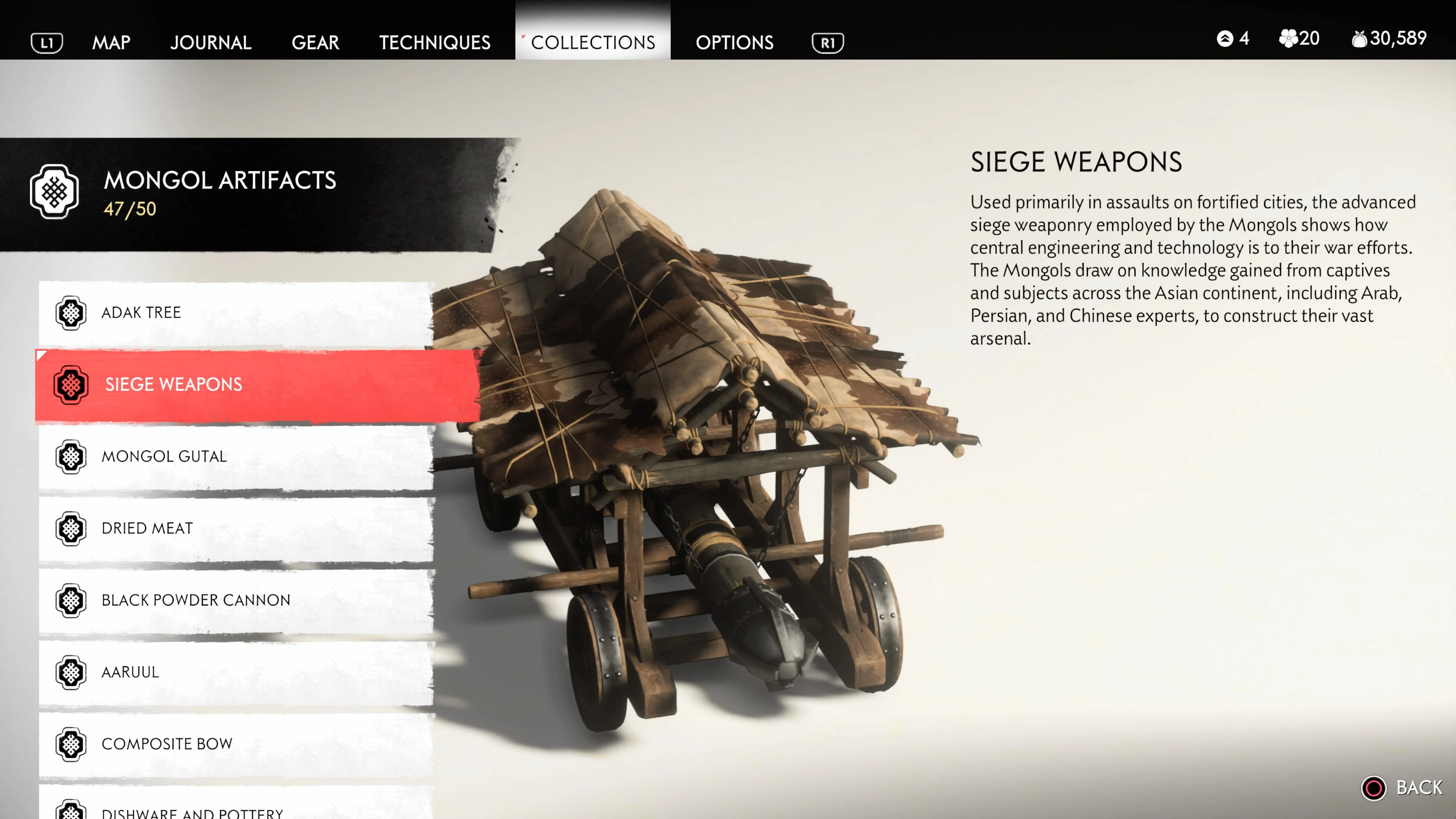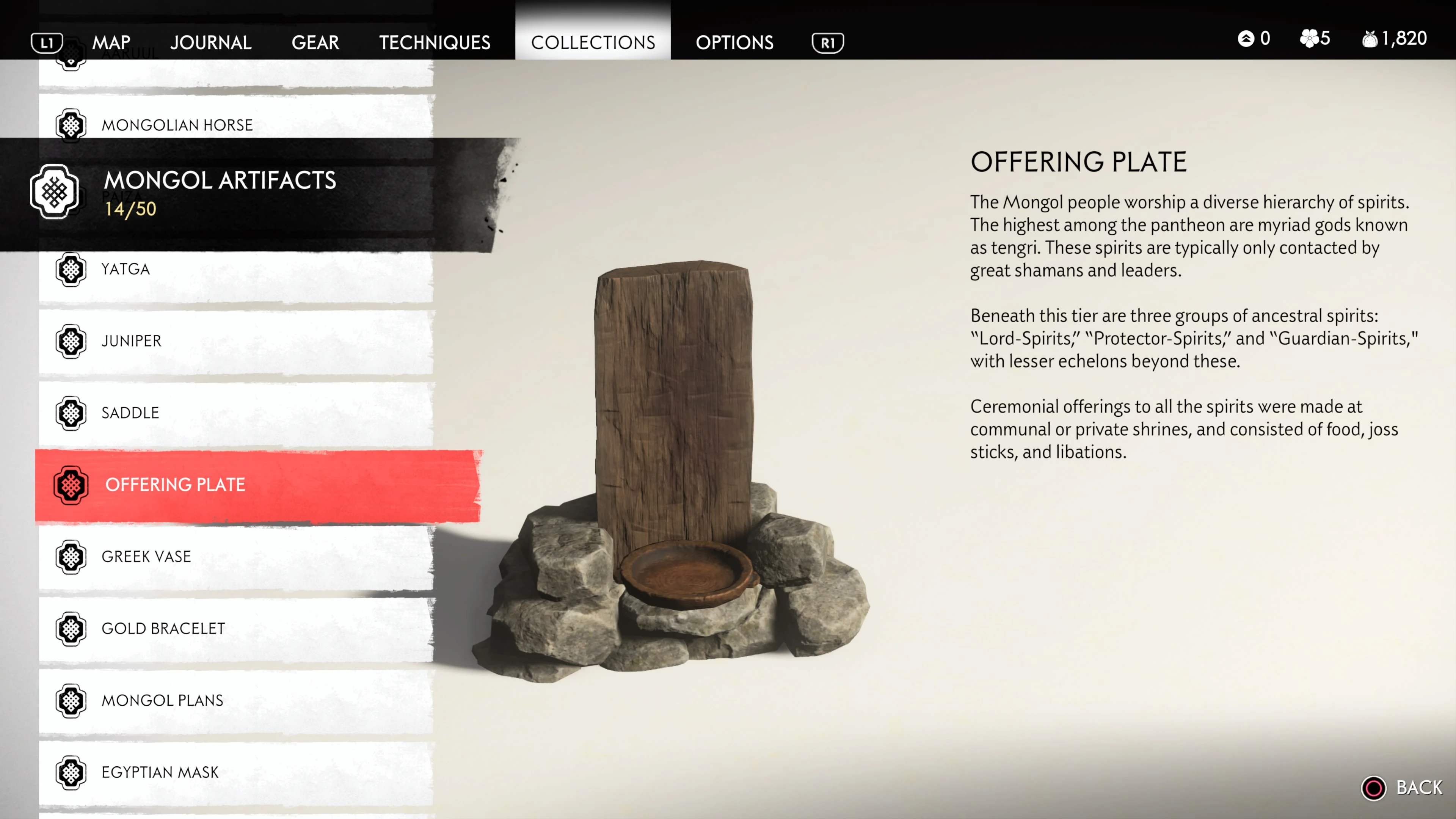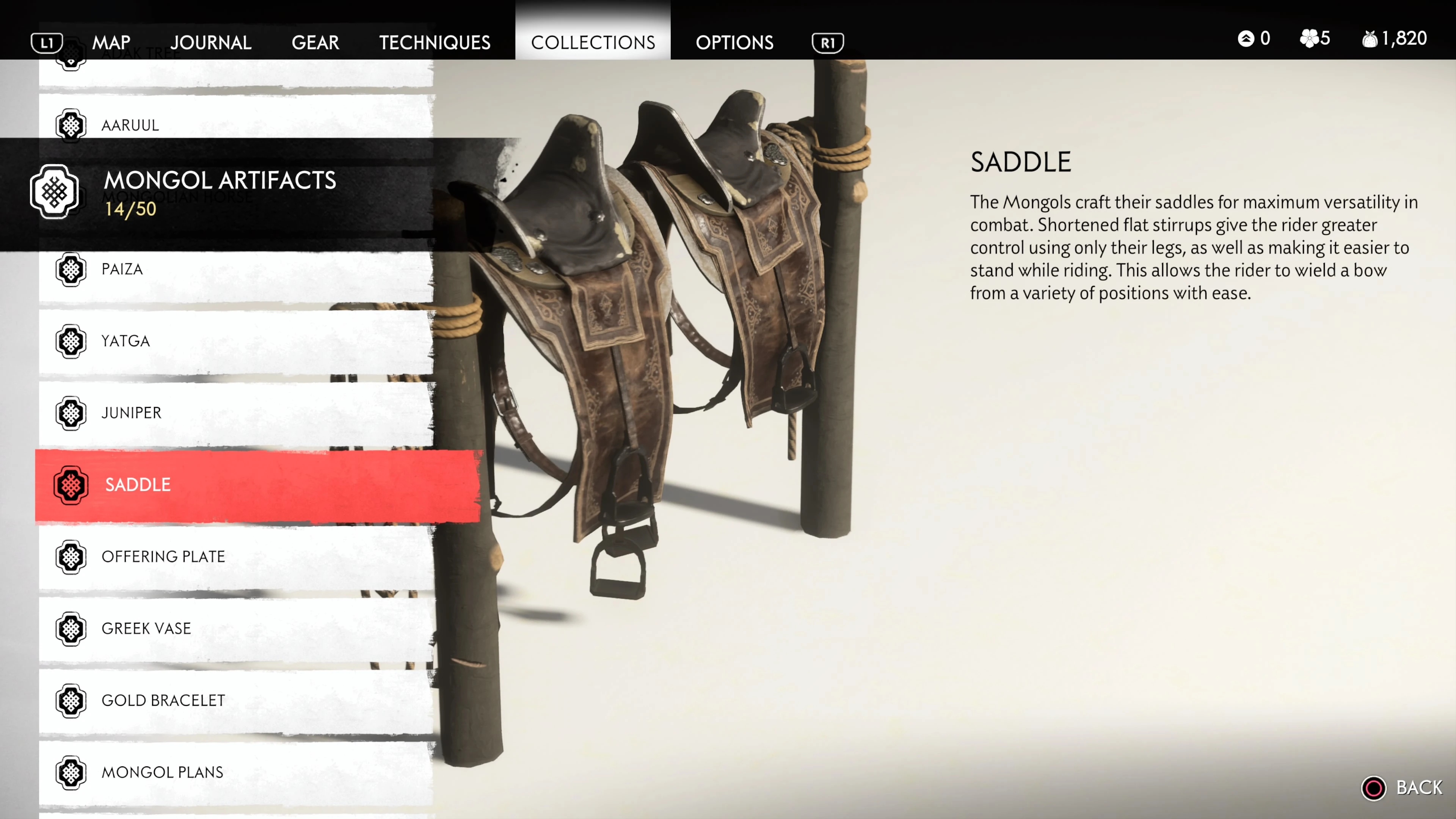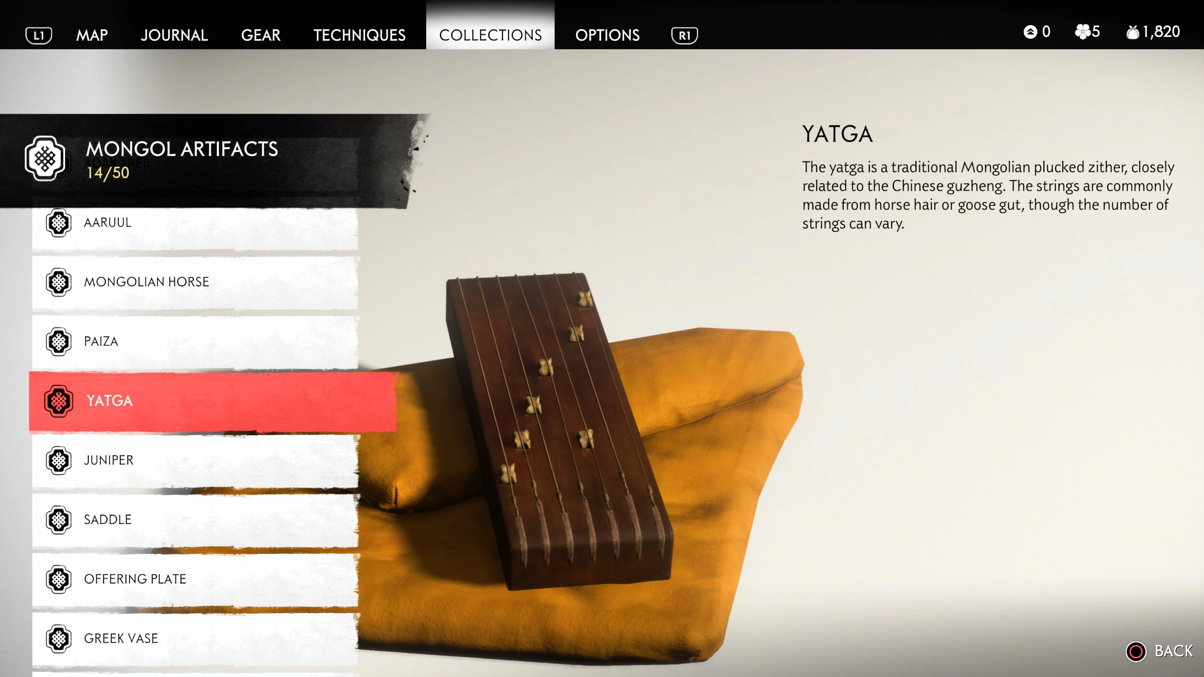 Mongol Artifacts are collectible items that are found throughout the island of Tsushima. They provide useful information on the Mongol Empire, including their way of life and approach to war. There are fifty (50) Mongol Artifacts in the game and collecting twenty (20) of them counts towards the "Know Your Enemy” trophy.