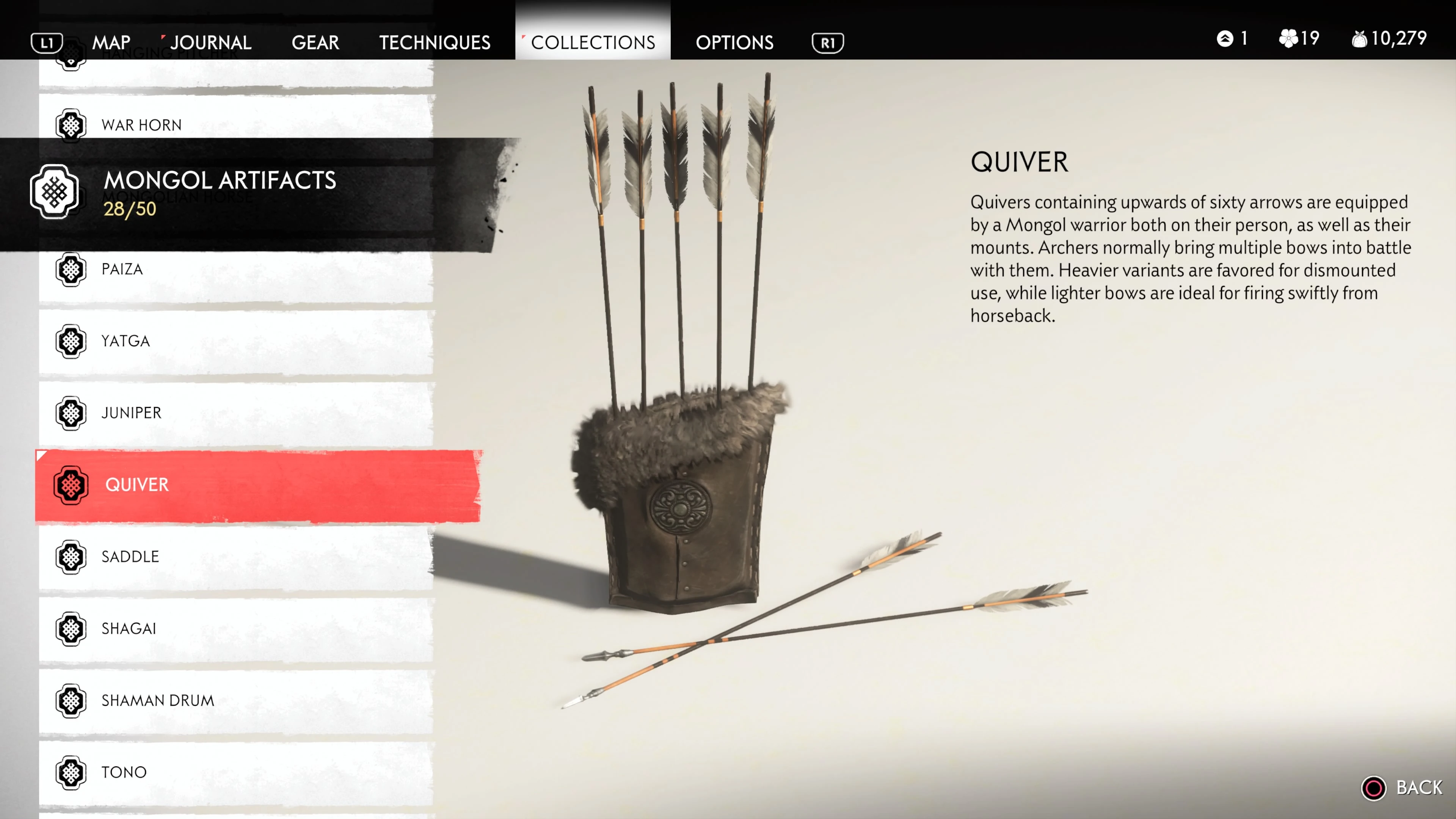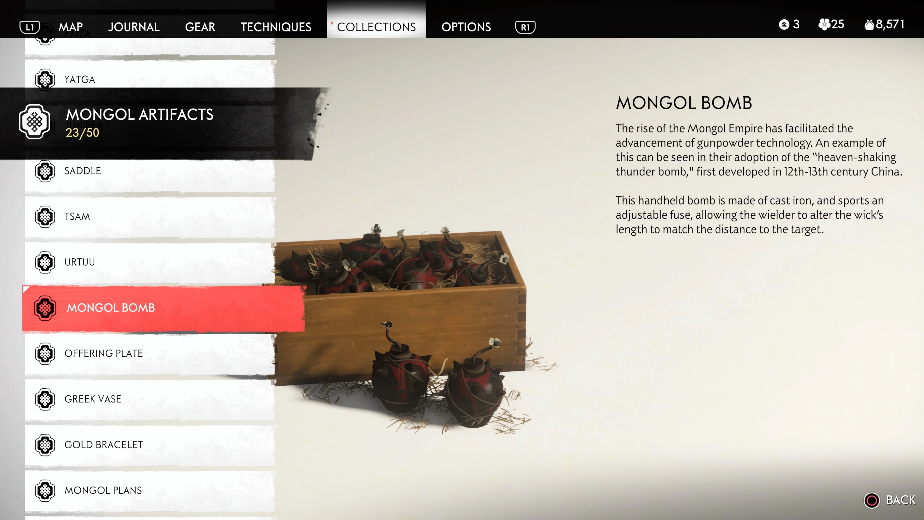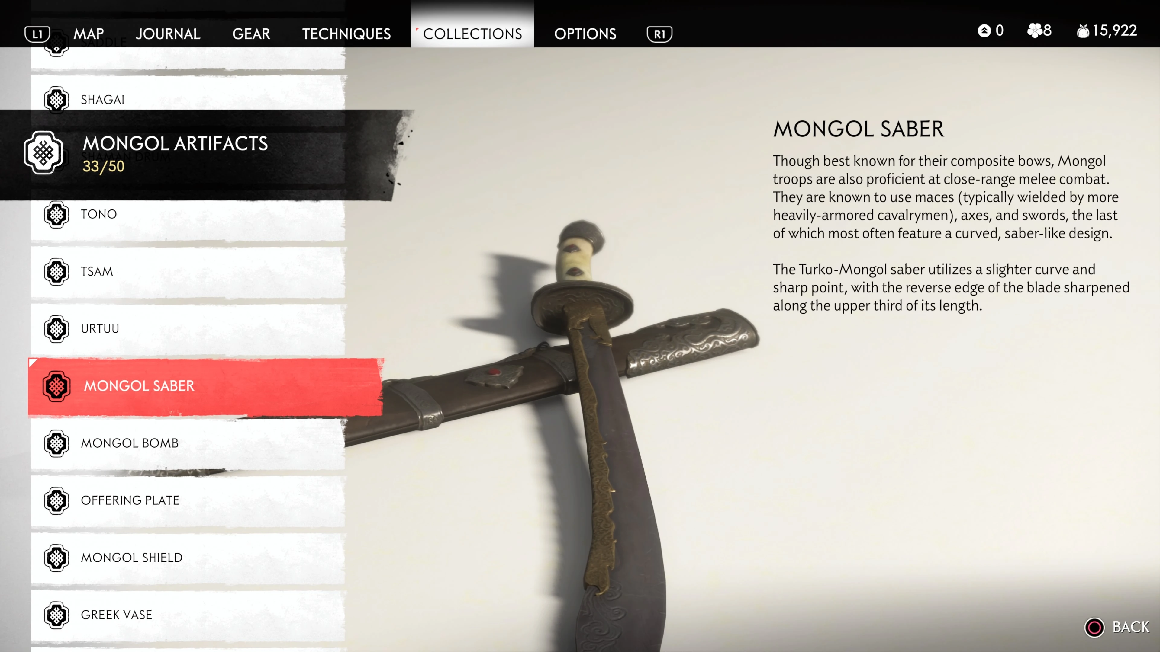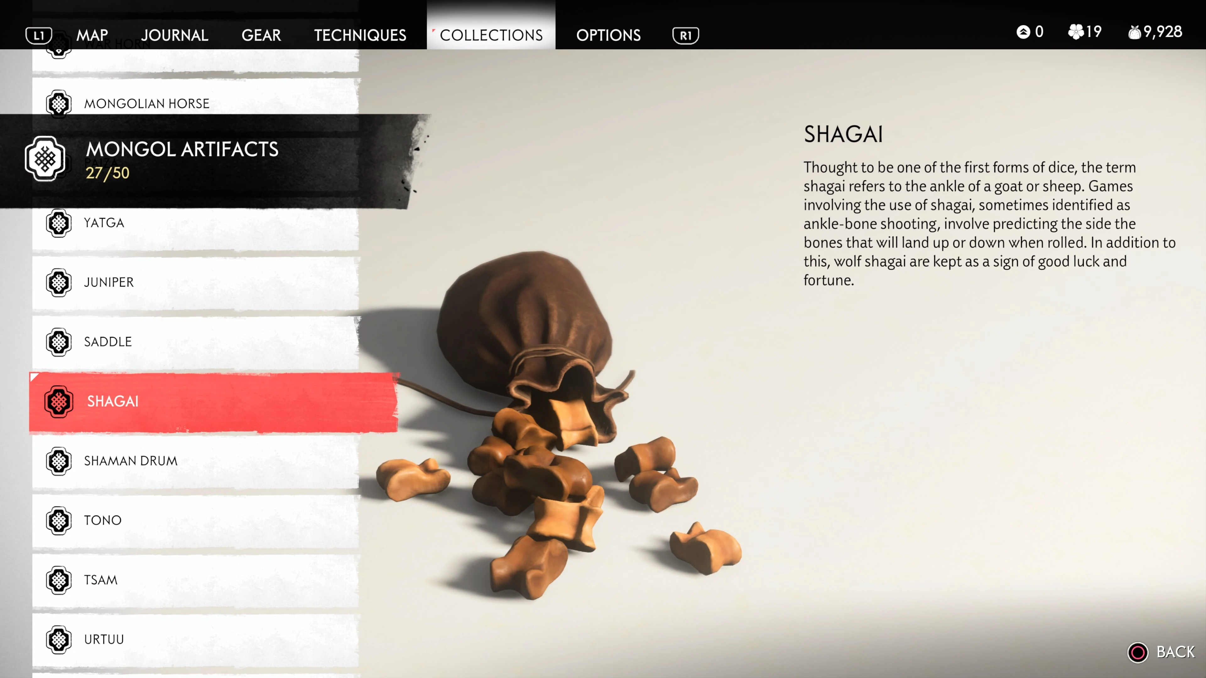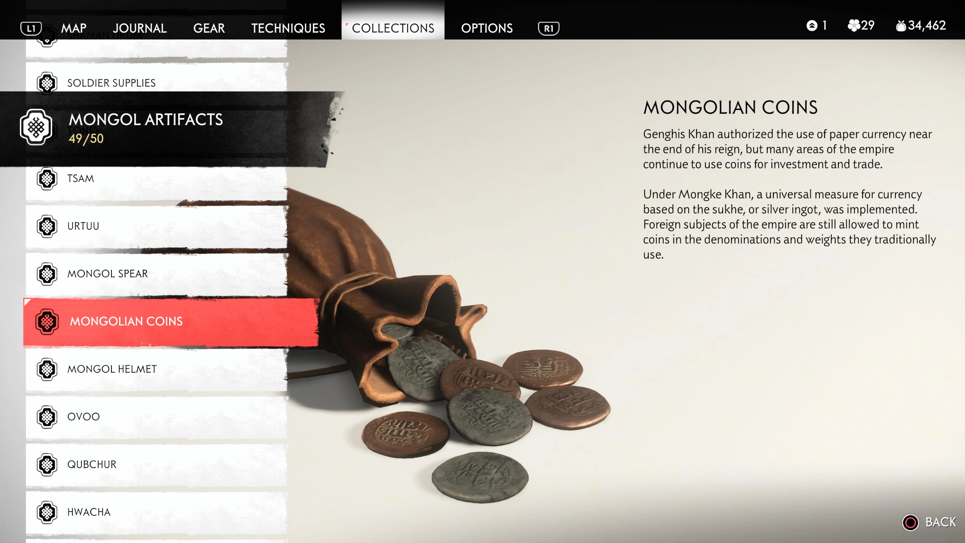 Mongol Artifacts are collectible items that are found throughout the island of Tsushima. They provide useful information on the Mongol Empire, including their way of life and approach to war. There are fifty (50) Mongol Artifacts in the game and collecting twenty (20) of them counts towards the "Know Your Enemy” trophy.