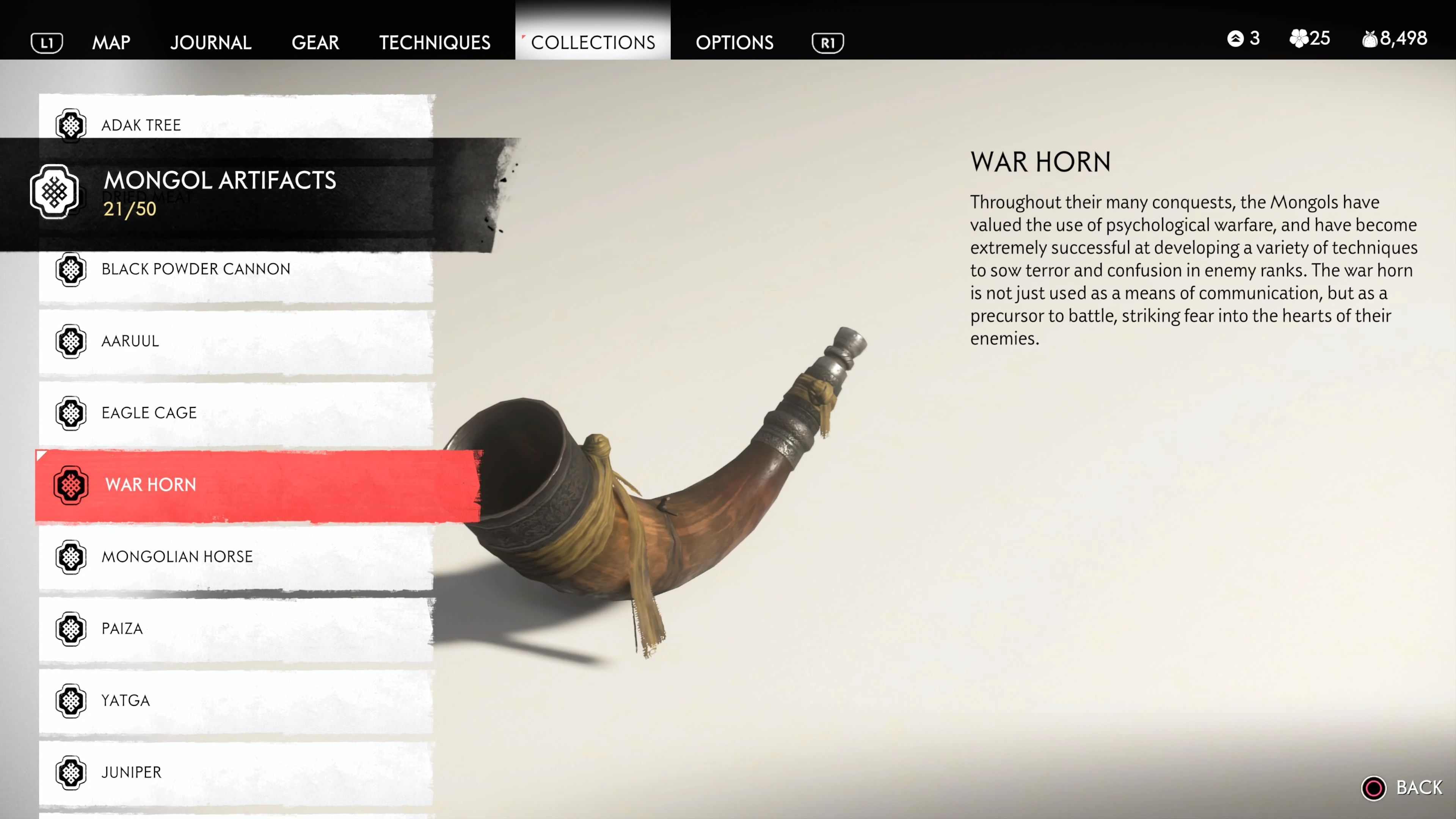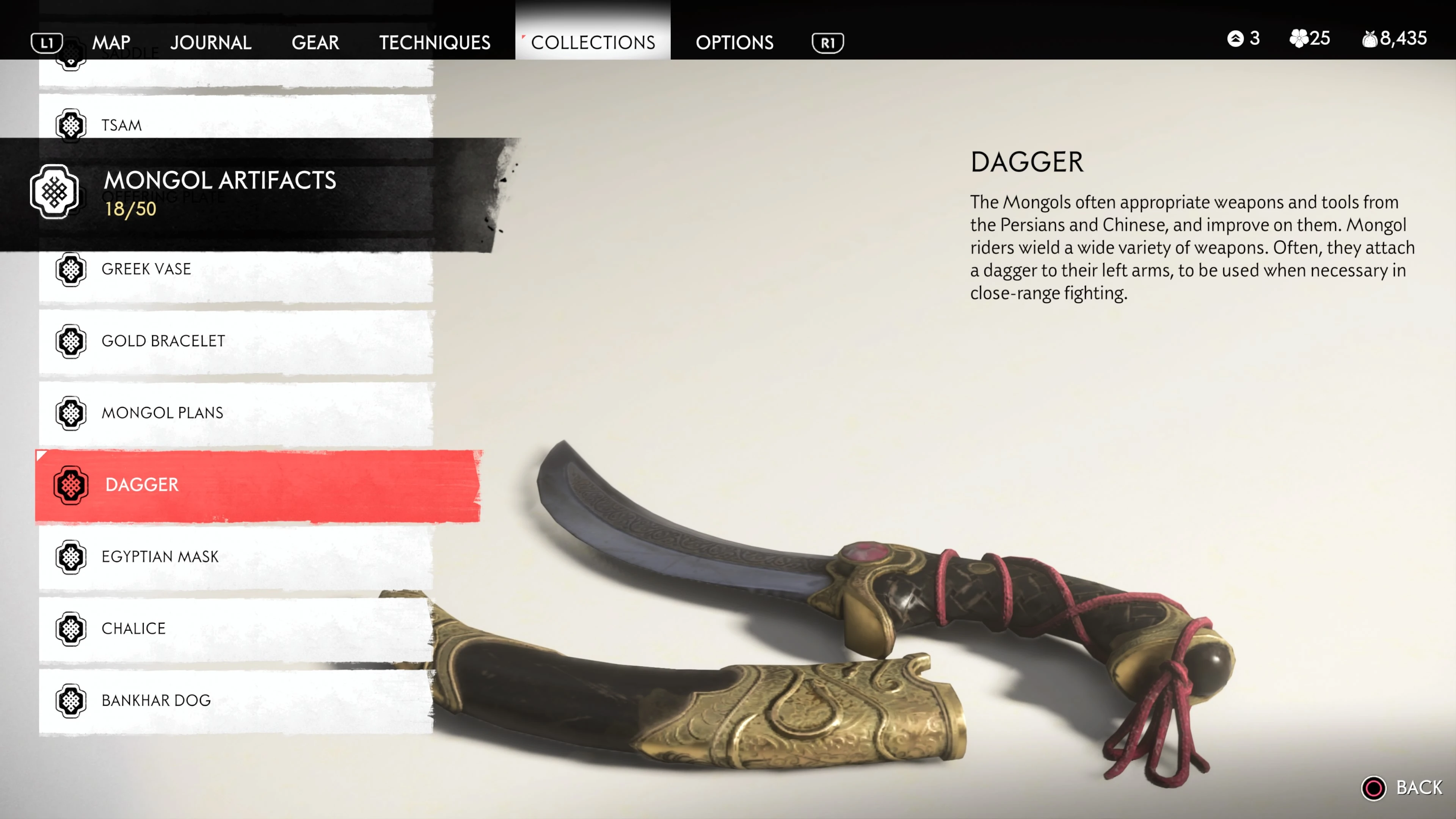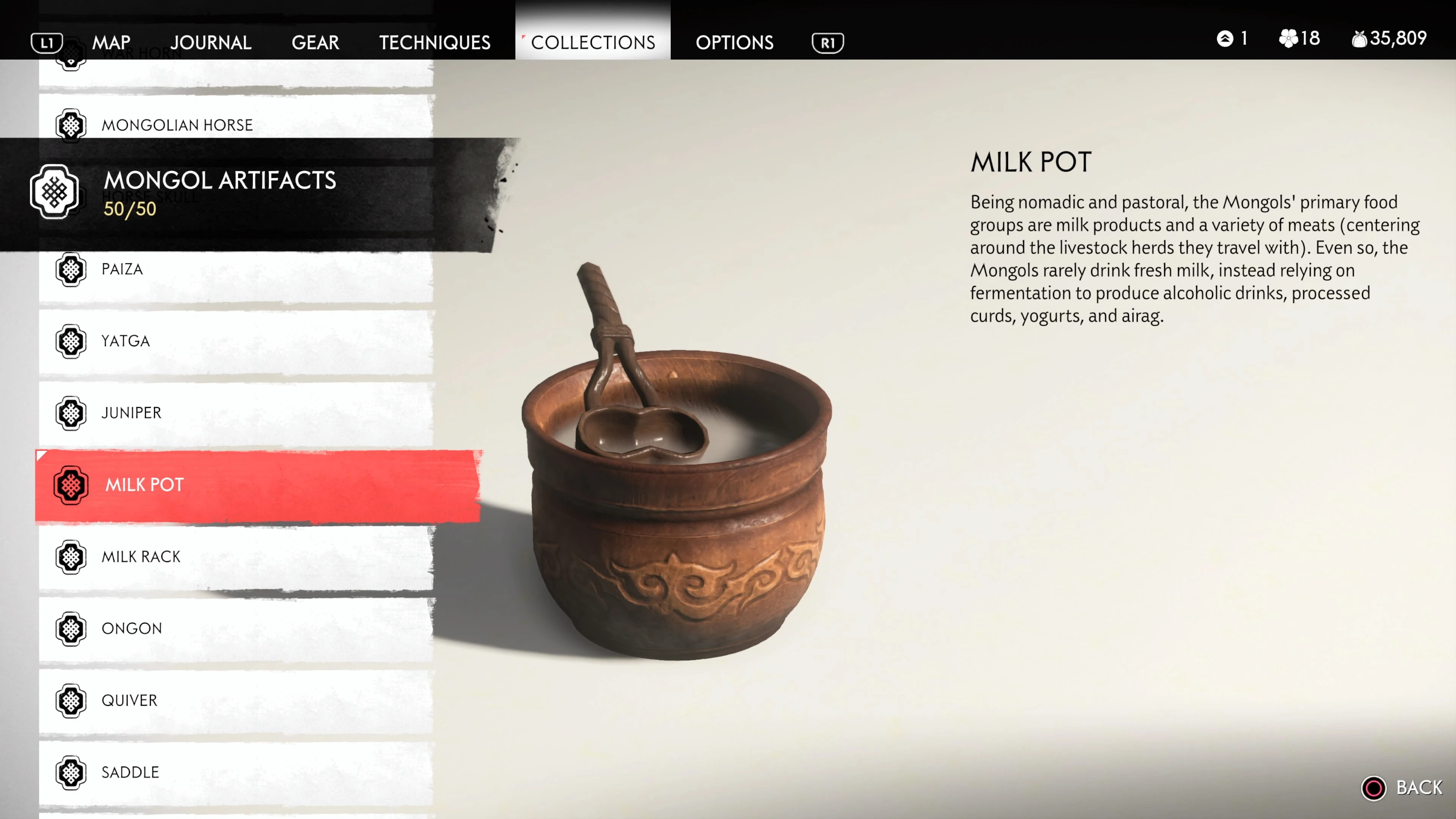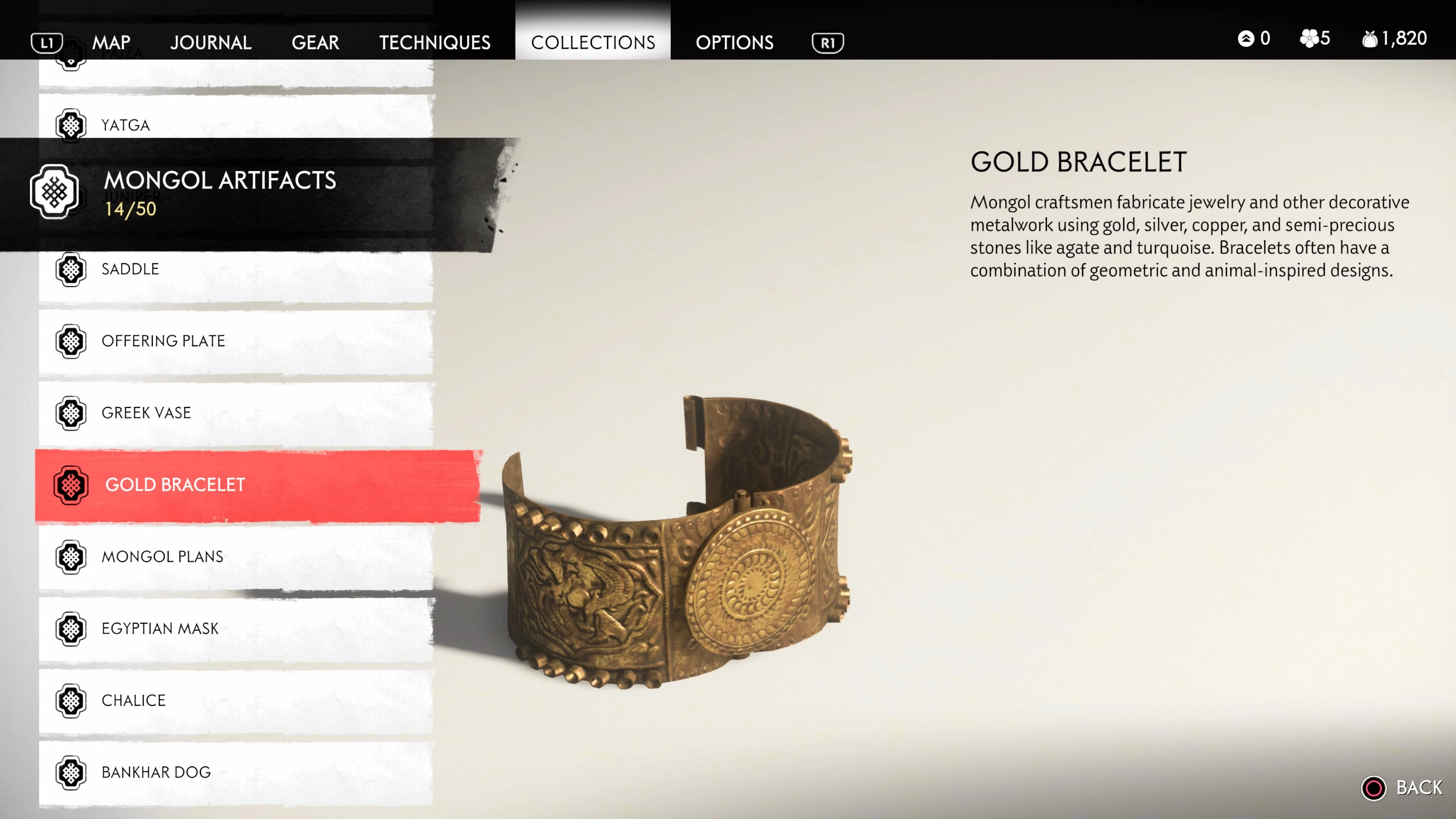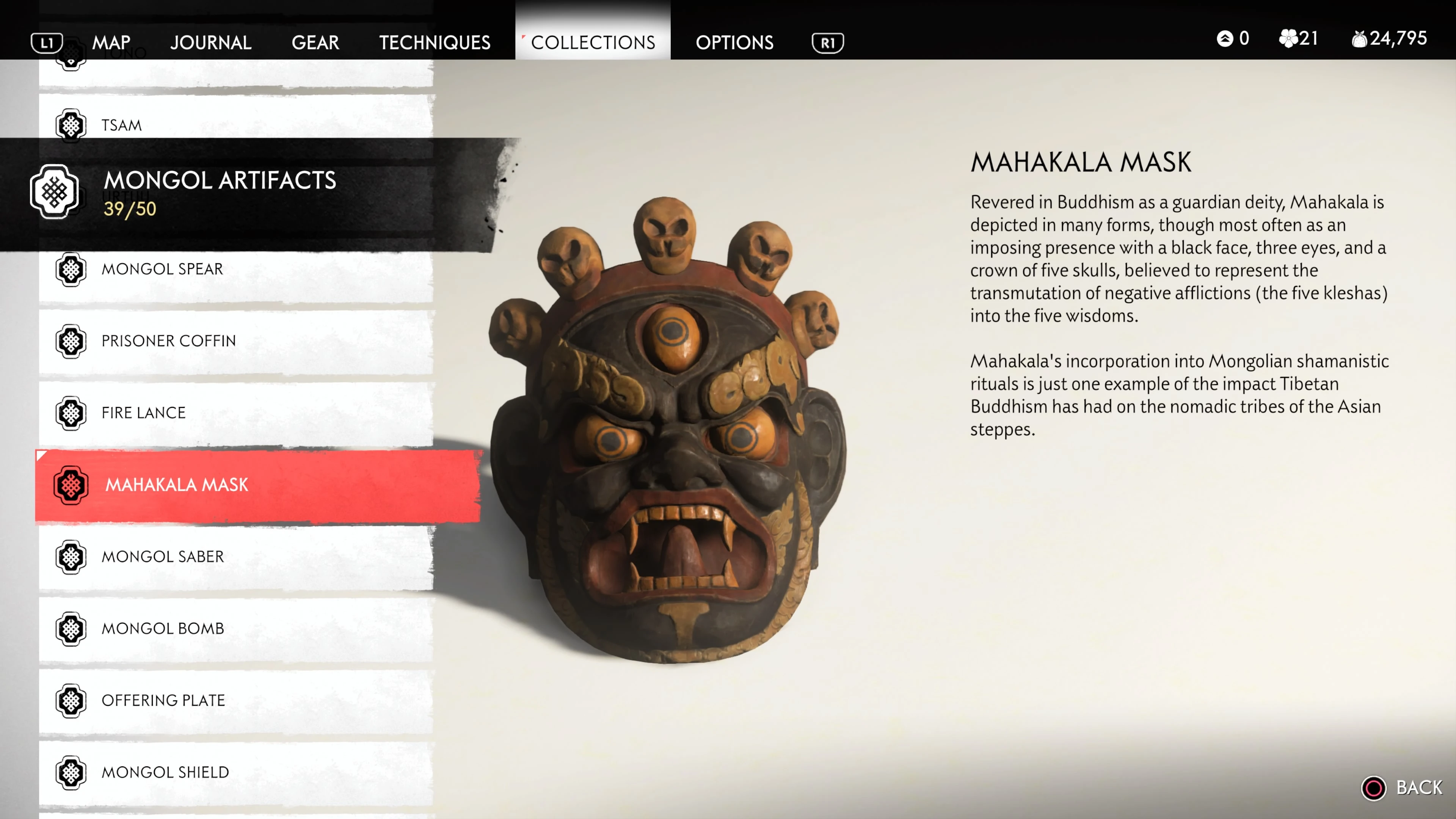 Mongol Artifacts are collectible items that are found throughout the island of Tsushima. They provide useful information on the Mongol Empire, including their way of life and approach to war. There are fifty (50) Mongol Artifacts in the game and collecting twenty (20) of them counts towards the "Know Your Enemy” trophy.