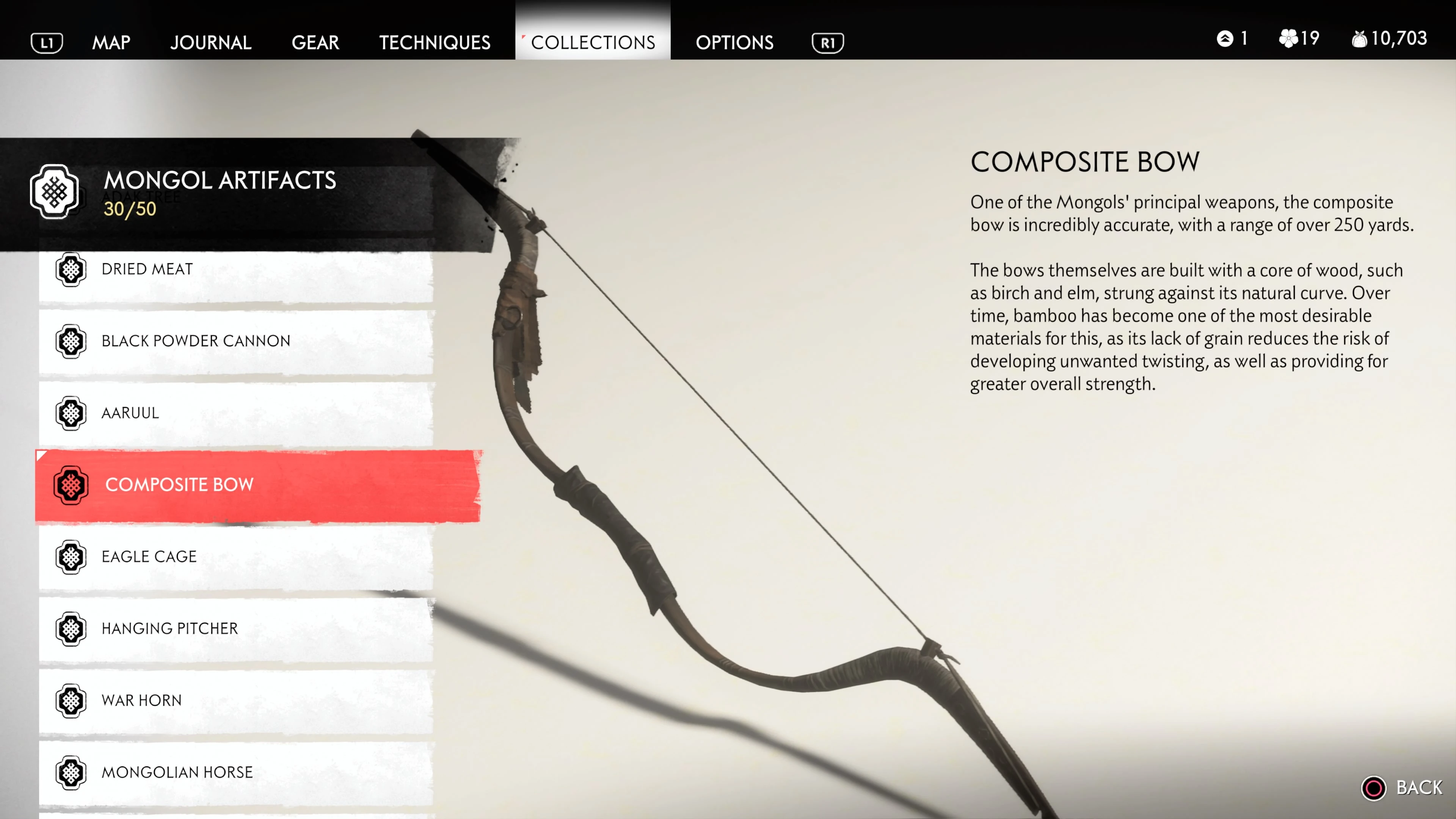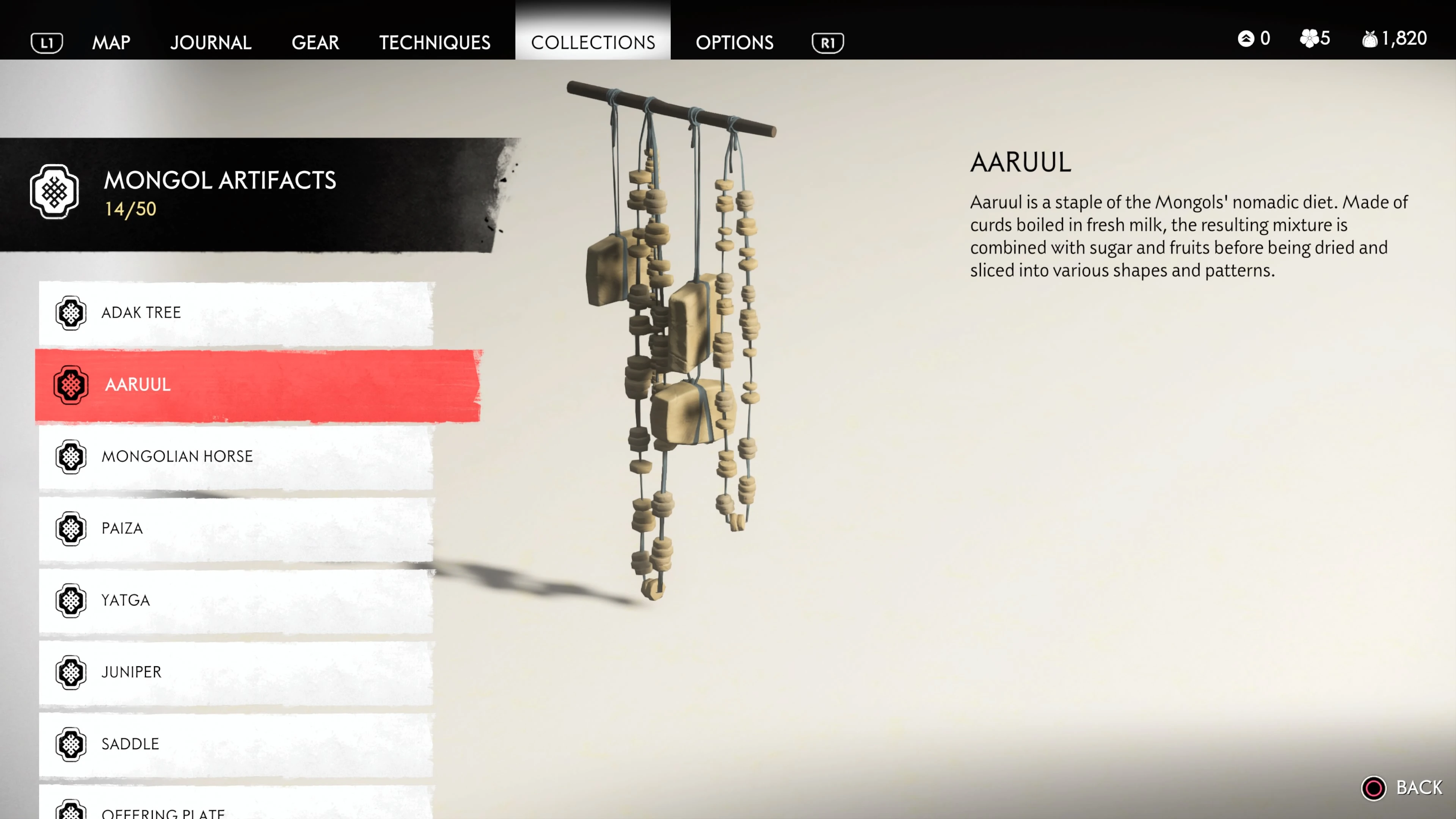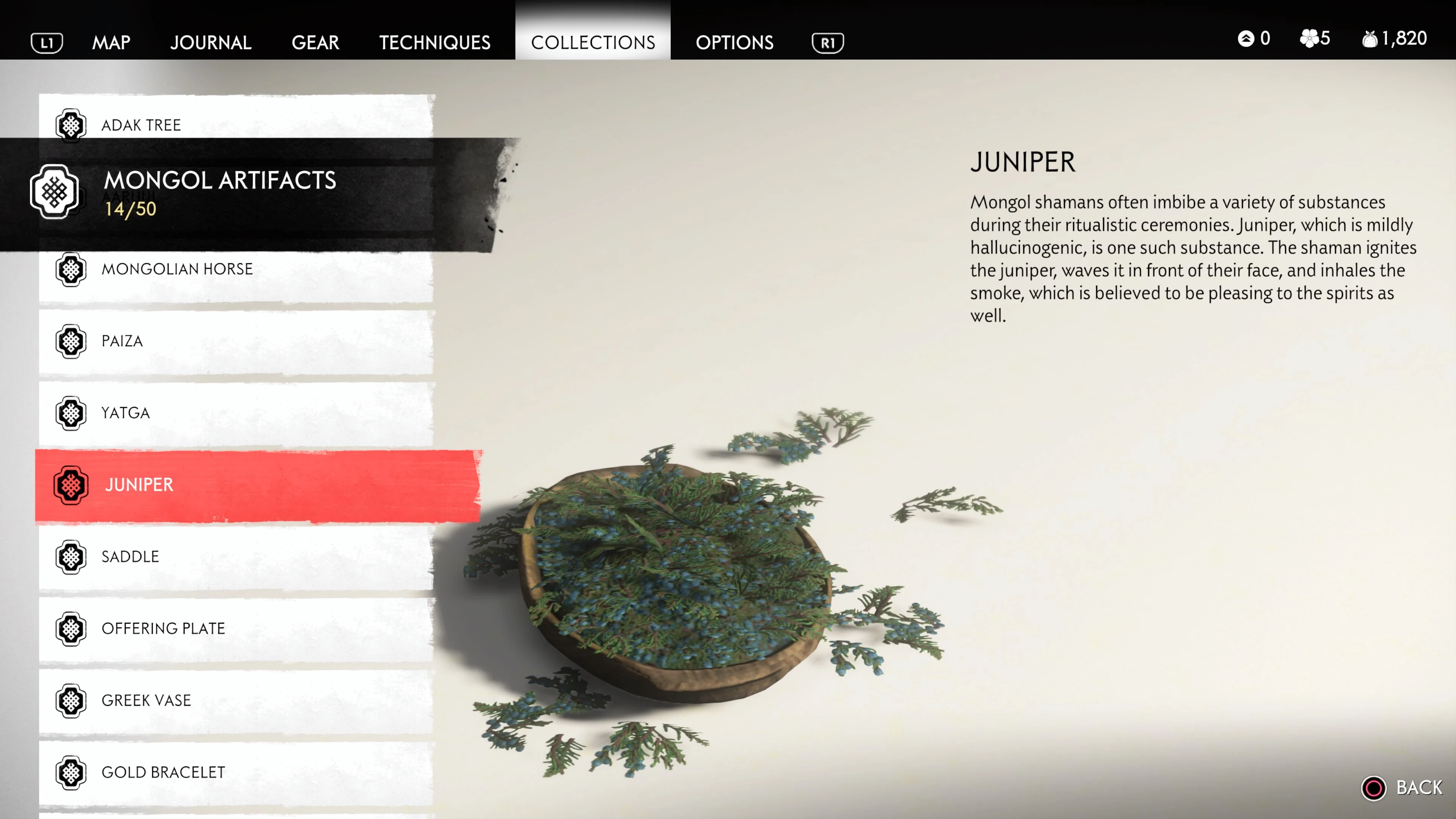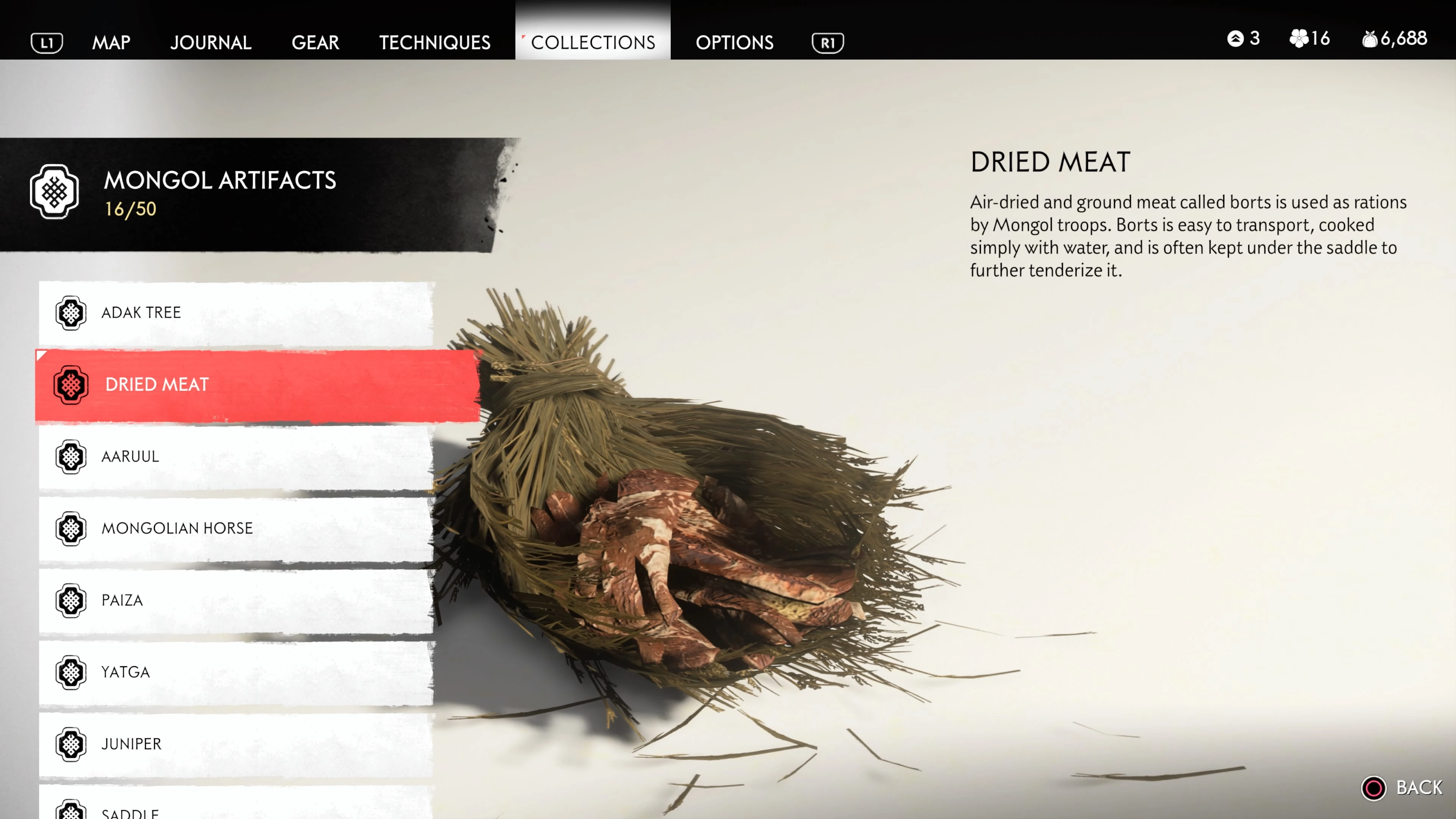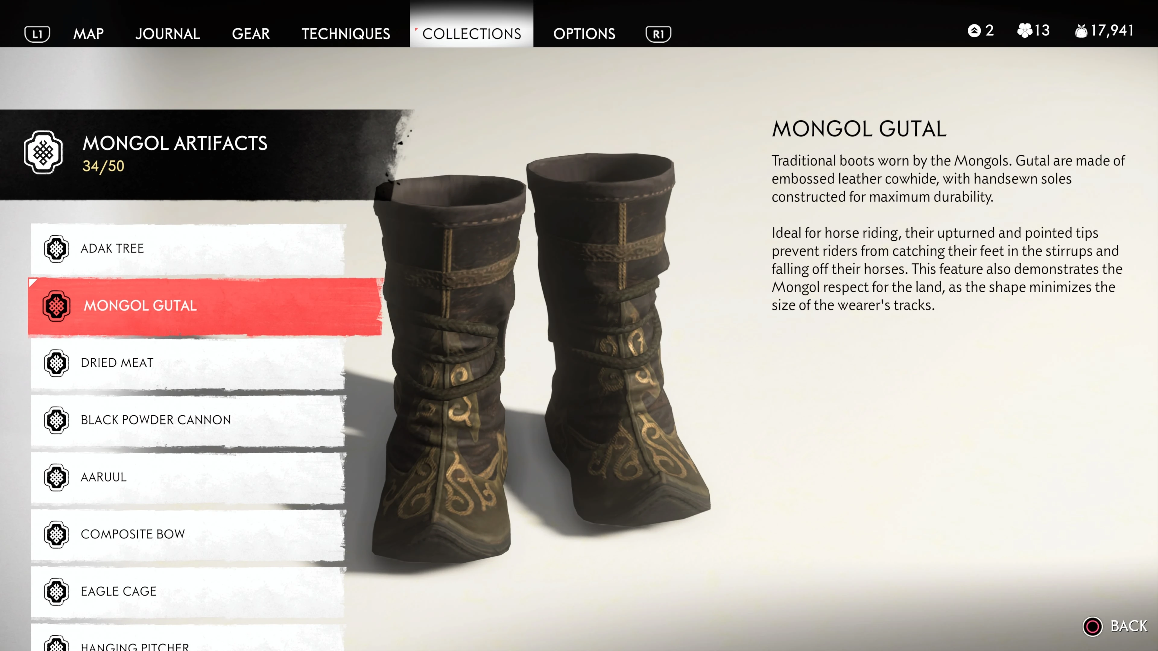 Mongol Artifacts are collectible items that are found throughout the island of Tsushima. They provide useful information on the Mongol Empire, including their way of life and approach to war. There are fifty (50) Mongol Artifacts in the game and collecting twenty (20) of them counts towards the "Know Your Enemy” trophy.